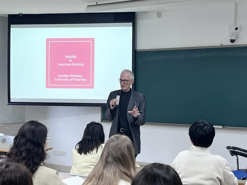 斯莱索格教授认为,美国绘画的发展始终与工业革命和交通基建发展紧密相连、同步演进。19世纪,欧洲浪漫主义与美国超验主义交融,催生了以自然为主题的哈德逊河画派,艺术家以荒野、河流与西部景观,展现了早期美国社会的空间流动。美国内战成为重要转折,现实主义绘画随之兴起,铁路、驿站等现代交通符号进入画面,艺术中的流动性从自然景观转向社会生活。20世纪初,印象派与现代艺术聚焦城市桥梁、街道、铁路与航运,呈现出现代都市的流动图景。铁路、大桥不仅是基础设施,更成为时代发展与人口迁徙的重要象征。进入后现代时期,汽车、公路、加油站等新符号取代传统交通意向,艺术家以波普艺术、照相写实、跨界创造等多元形式,在展现汽车文化繁荣的同时,也对技术与现代性的多重内涵进行反思。整场讲座立足艺术史,融合社会、技术与文化视角,以独特思路解读美国视觉文化的变迁,内容充实、视野开阔,为跨文化、跨学科研究提供有益启示。