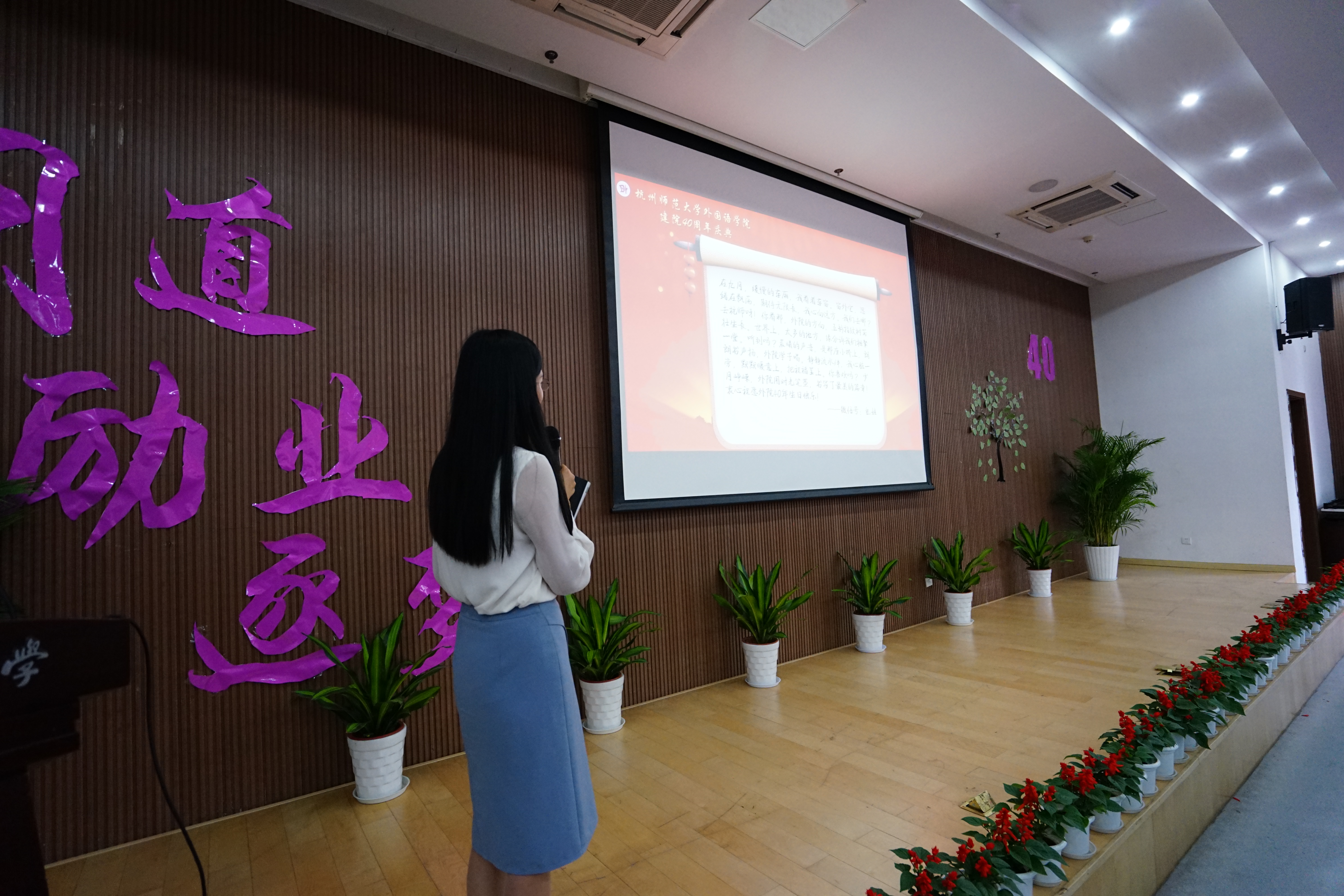 为庆祝建校110周年暨外国语学院建院40周年,5月12日下午13:30,“问道、励业、逐梦”建院40周年庆典在恕园19-109报告厅隆重举行。出席本次庆典的嘉宾有学院老教师、老领导代表、高层次人才代表、校友分会第一届理事会成员、全体党政班子成员以及250余名校友代表。