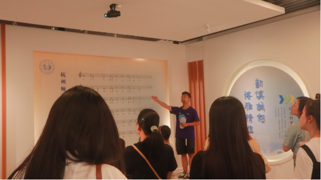 会后,校友们集体参观了下沙校区育华厅。翻译211班袁铭欣同学经过暑期学校线上培训,为学姐们讲解学校发展历史沿革、发展脉络及办学成就等。在校歌墙前,校友们情不自禁地集体哼唱起来,对母校的深情厚谊令人动容。大家饱含深情地说:“回到校园就是开心,是别的地方找不到的快乐。”校友们表示,看到学校取得的发展和成就,由衷地感到骄傲和自豪,希望母校越办越好,母校的明天更加灿烂辉煌。