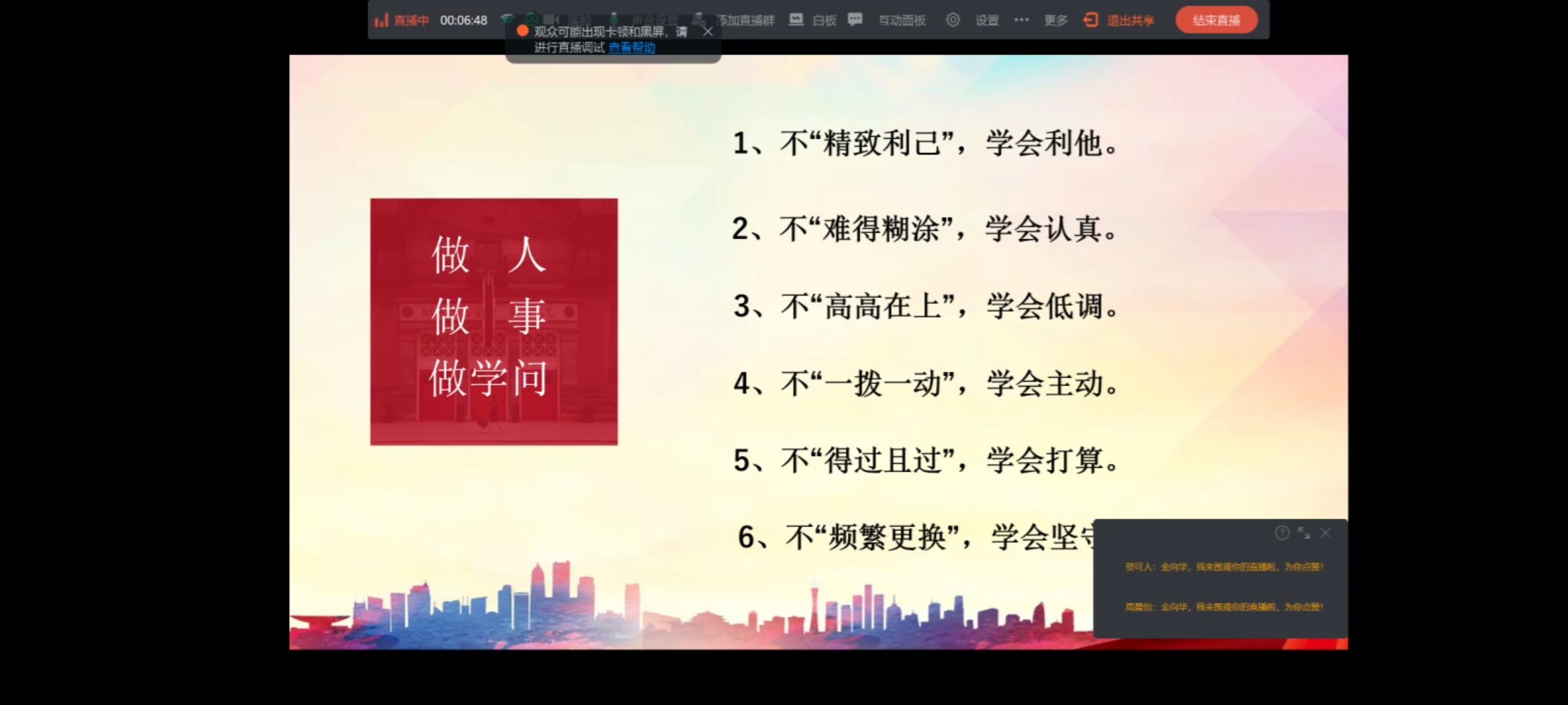 讲座主题为 “遇见卓越,遇见更好的自己”。金部长从“做人、做事、做学问”三个角度阐述了自身独到的见解与智慧。她言简意赅地将要义凝聚为一个“实”字,从多个角度向同学们解释了“实”在不同层面所蕴含的哲理与智慧。对于做人,坚守诚实;对于做事,讲求踏实;对于做学问,强调真实。同时,她也赋予“知足”以全新的理解和灵活的运用,“做人要知足,做事要知不足,做学问要不知足。”唯有辩证对待“知足”,才更能在漫漫人生路中收获更加卓越的自己。在提高领导力的方式方法上,金部长结合自身经历,精炼地总结了“六不”与“六学会”原则。第一,不“精致利己”,学会利他;第二,不“难得糊涂”,学会认真;第三,不“高高在上”,学会低调;第四,不“一拨一动”,学会主动;第五,不“得过且过”,学会打算;第六,“不频繁更换”,学会坚守。除此之外,金部长鼓励同学们要敢于“吃苦”与“吃亏”。“吃苦是磨练”,她将吃苦形象地比喻为吃药,进而点明吃苦对个人发展和素质提升的关键作用。同时,她也强调“吃亏是福气”,学生干部要接受吃亏,更敢于吃亏。吃苦与吃亏都是个人品质的修行,理性思考其中的辩证关系并加以转化,付出在未来必定会有收获。