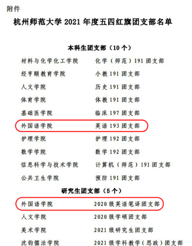 2021年11月25日,在由共青团 日本色情片 委员会主办的2021年 日本色情片 “五四红旗团支部”风采展示评选活动中,外国语学院英语193团支部、20级英语笔译团支部表现突出,获评校级“五四红旗团支部”称号。