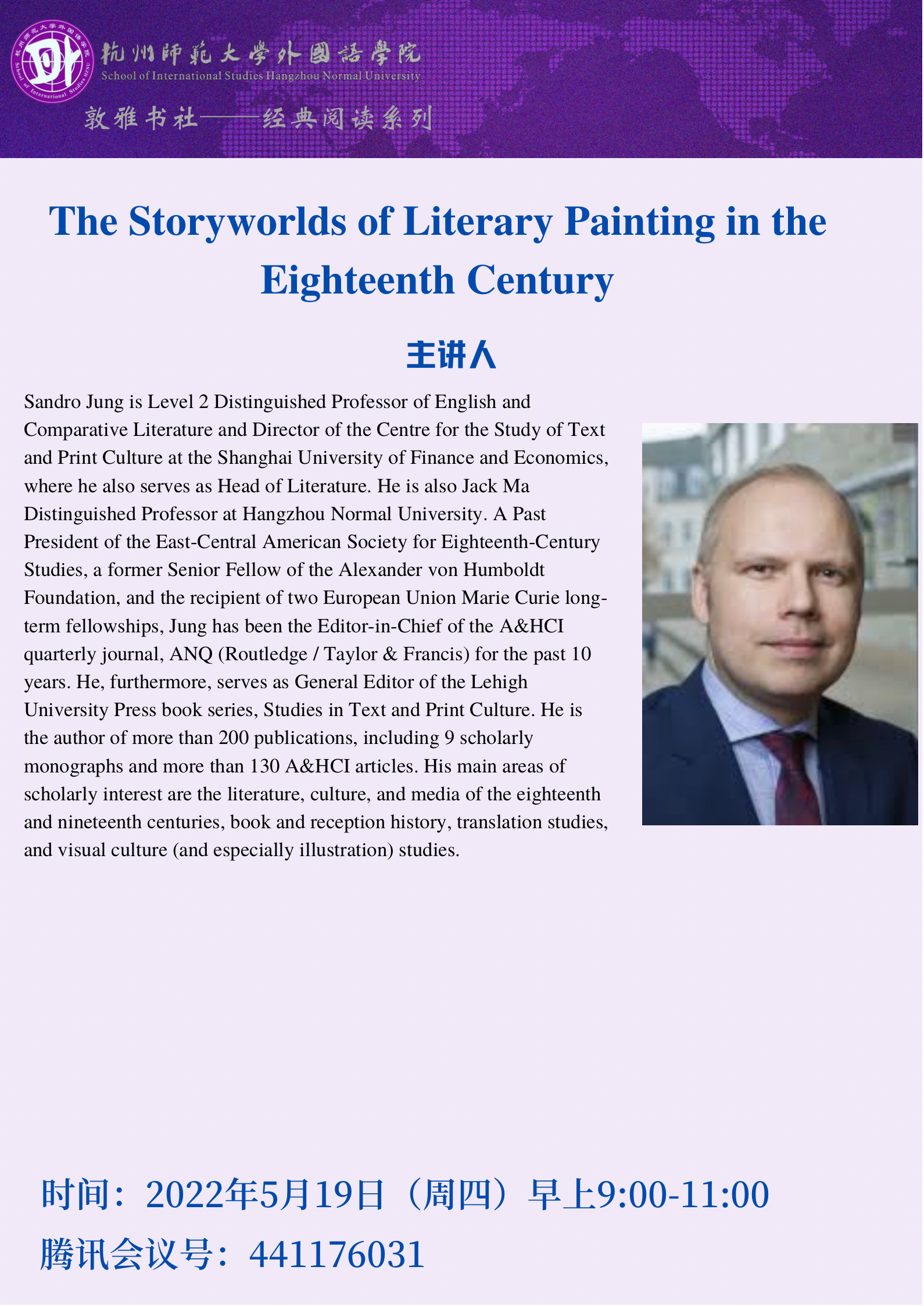 2022年5月19日上午,上海财经大学英语与比较文学特聘教授、 日本色情片 “马云基金”特聘教授Sandro Jung 应邀为 日本色情片 研究生作了题为 《十八世纪英国文学绘画中的故事世界》的讲座。讲座由何畅教授主持,学院部分老师及研究生参加讲座。