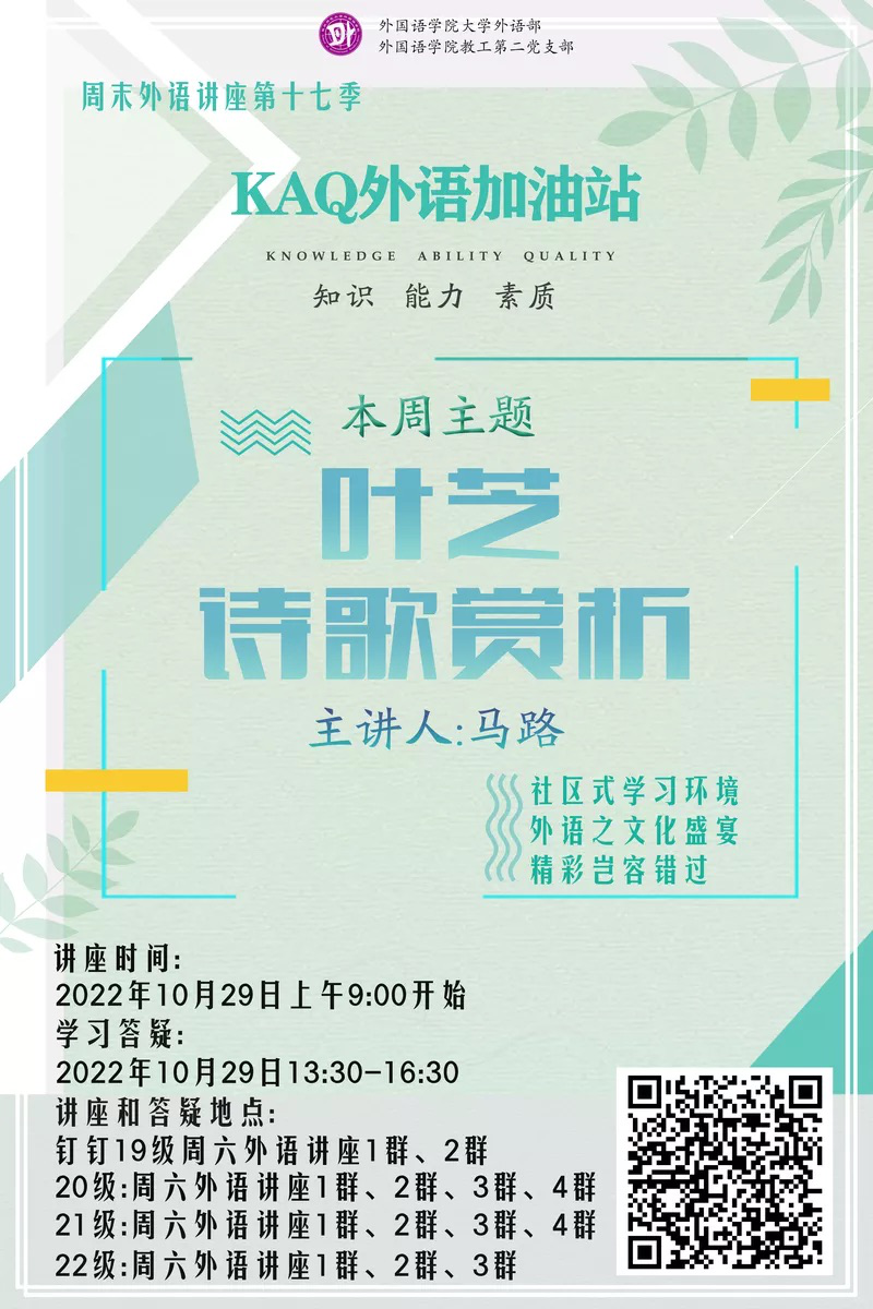 为了满足师大学生在外语能力上“一精多会”和“一专多能”的需求,“周六外语公益讲座——‘KAQ(知识、能力、素质)外语加油站’”,秉持一贯的SIM(student-centered, Innovative,Multilingual)理念,坚持“以生为本、不断创新、多语种国际视野”。考虑到学生对于英语文学知识等方面的广泛兴趣,特邀请大外部的马路老师于2022年10月29日给同学们带来了一场题为“叶芝诗歌赏析”的讲座,并通过13个钉钉群进行线上联播。
