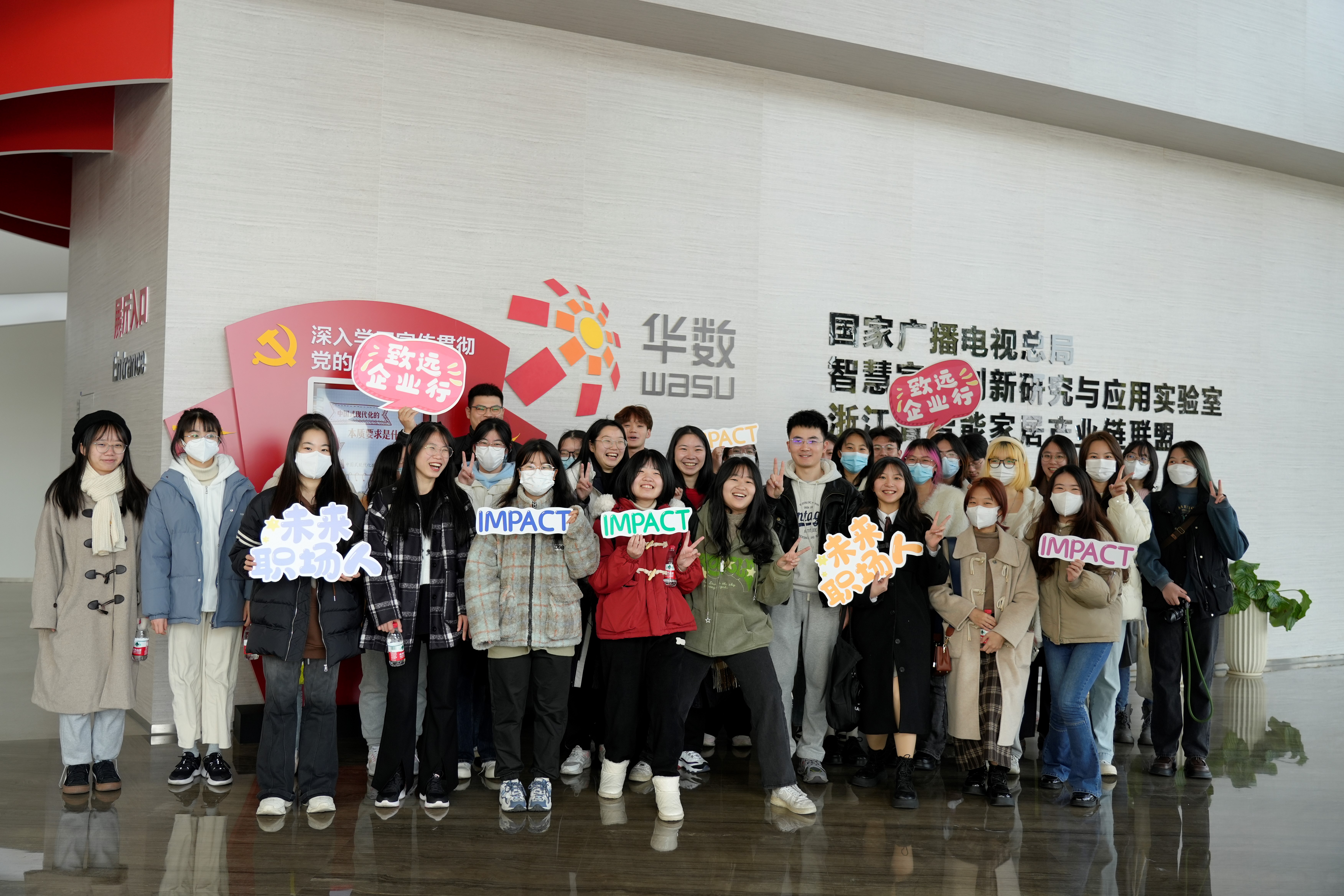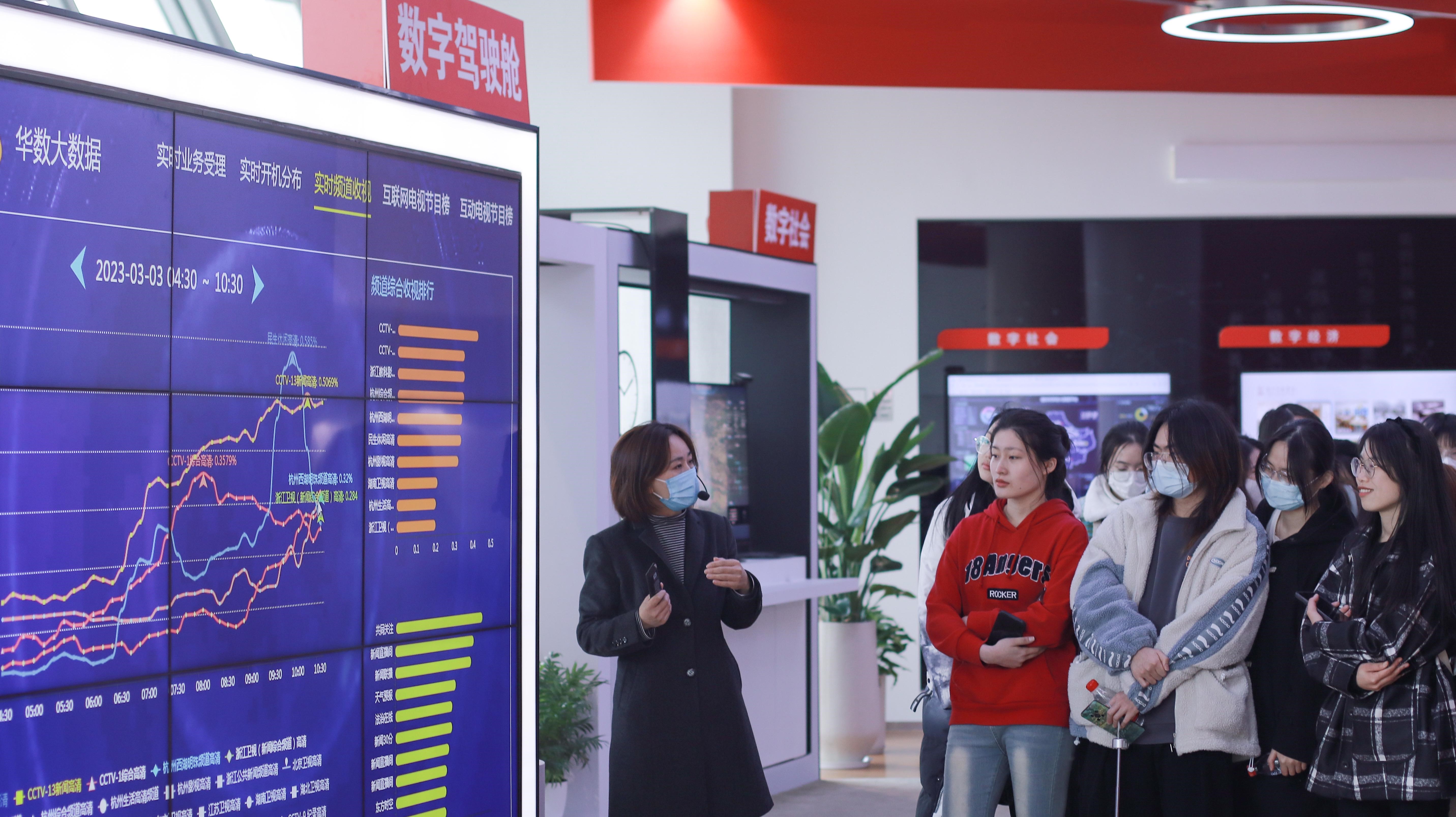 同一时间,外院经亨颐英语213班的同学们也在华数集团人力资源部老师们的带领下开展了一场“华数职场体验之旅”,学习了一堂别开生面的就业指导课。他们参观了华数数字电视产业园和企业展厅暨国家广电总局智慧家庭创新研究与应用实验室,现场观摩体验了“数字+”在新网络、新场景、新媒体、新治理、大数据等领域的创新产品应用。