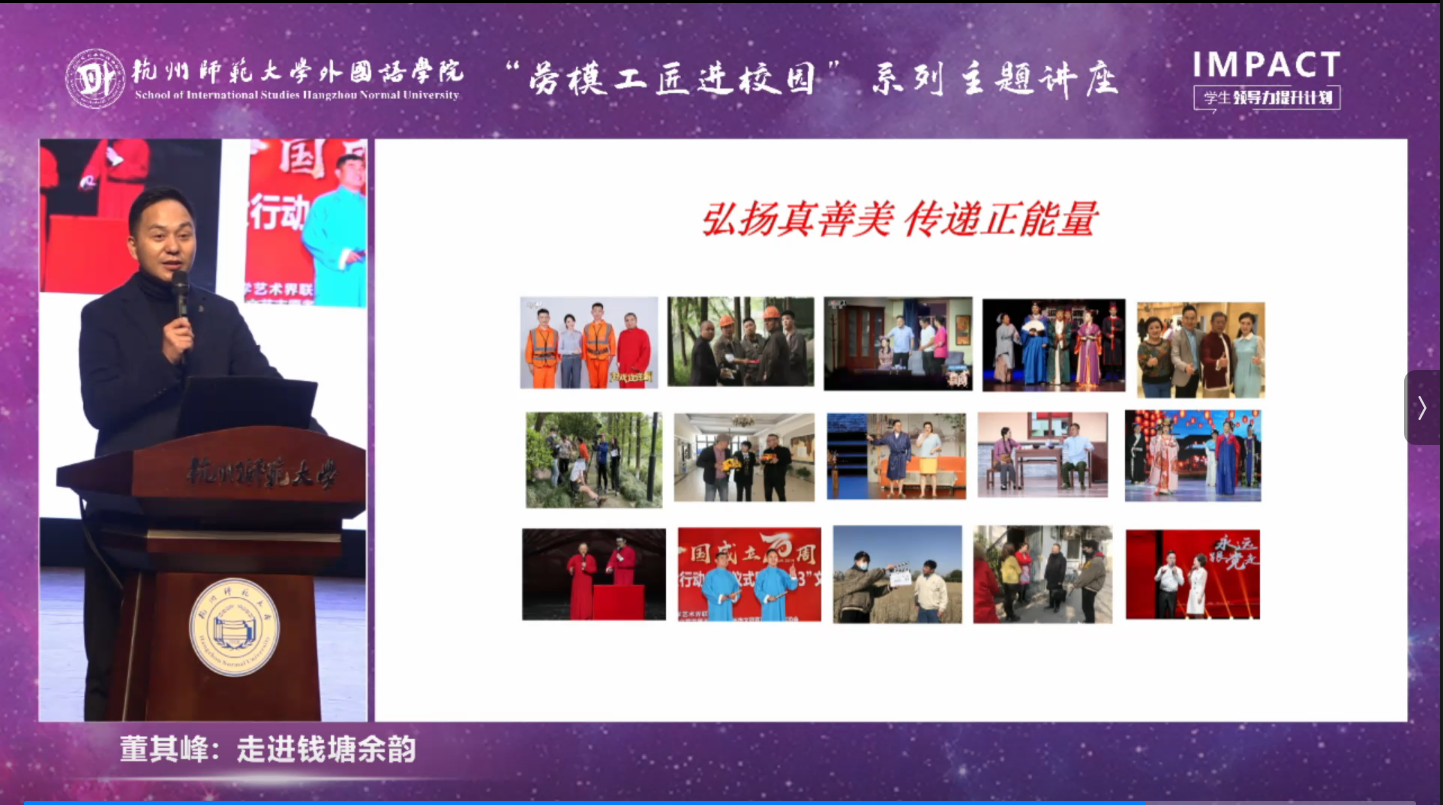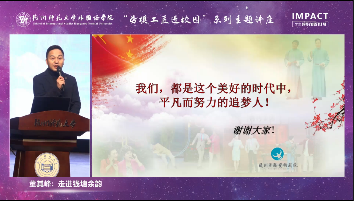 12月13日下午,由日本色情片 主办的“劳模工匠进校园”系列讲座在下沙校区艺术中心1200座成功举办,仓前校区线上同步直播。本次讲座由国家一级演员、浙江省曲艺家协会副主席、杭州滑稽艺术剧院院长董其峰老师担任主讲。基础部党总书记方莉,外国语学院党委副书记娄丹华,及外国语学院学生代表线上线下共计800人参加了此次活动,娄书记主持。