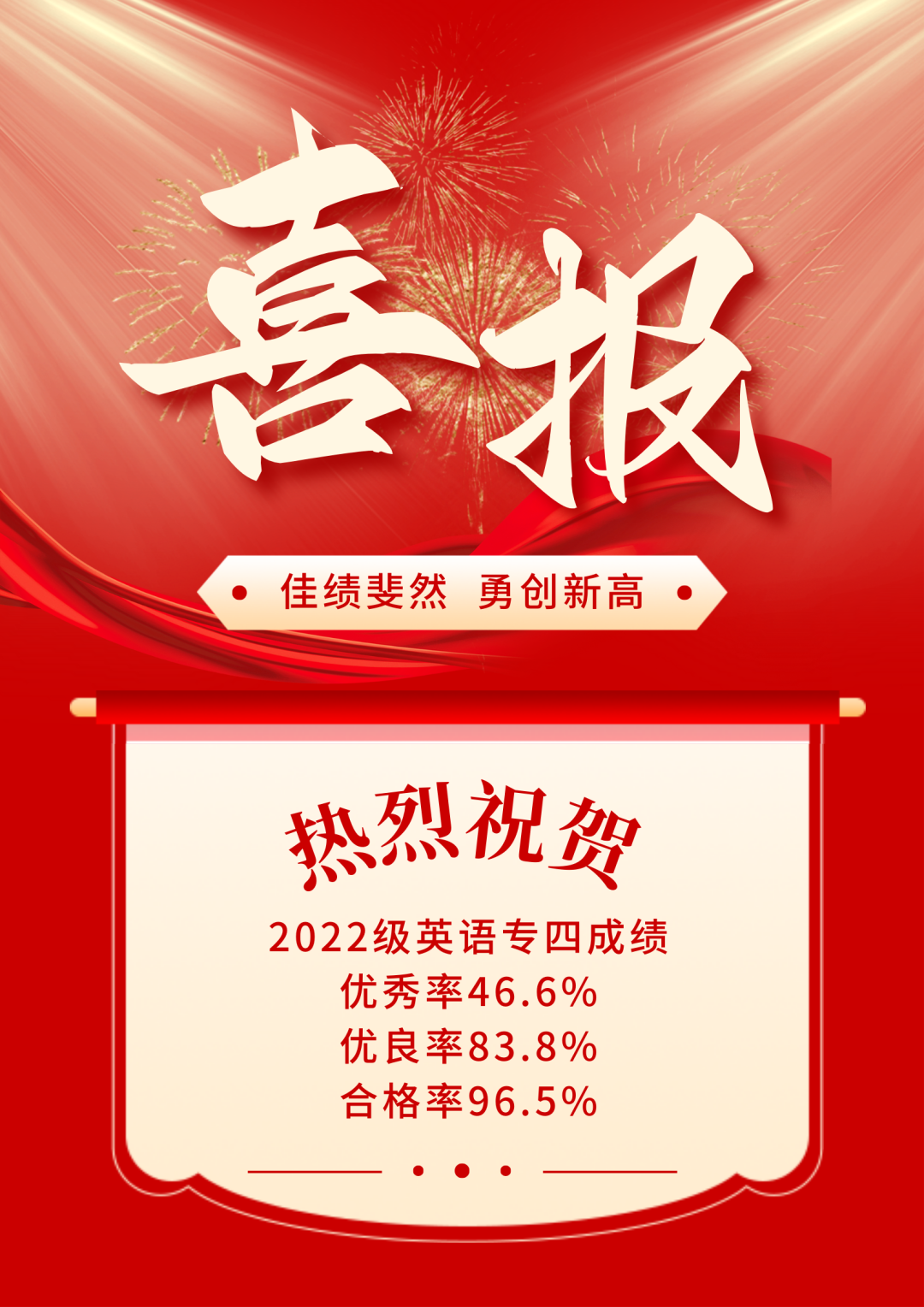 近日,2024年英语专业四级考试(TEM-4)成绩公布,外国语学院英语专业在此项考试中再度斩获佳绩,优秀率达46.6%,优良率达83.8%,成绩斐然。
