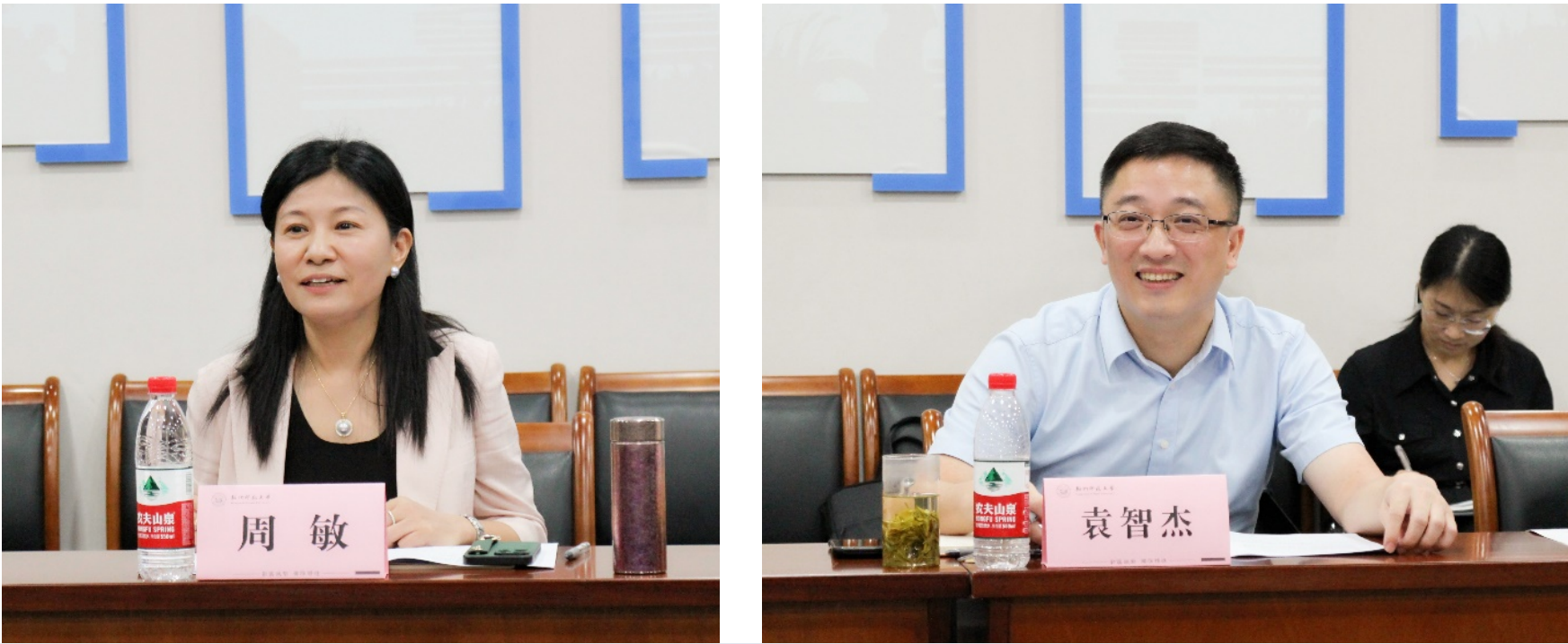 周敏和袁智杰代表学院班子衷心感谢学校和各职能部门、兄弟学院长期以来对学院各项事业发展提供的大力支持与指导帮助,一致表示今后将坚持学院发展方向、发展目标、发展路径不动摇,牢记“五问”,大力建设教育教学强、学术科研强、人才培养强、社会服务强、国际交流强的“五强”学院,在探索新时代育人方式上领风气之先,在推动学科转型提升育人质量上抢占制高点,力争早日实现争创一流的奋斗目标。