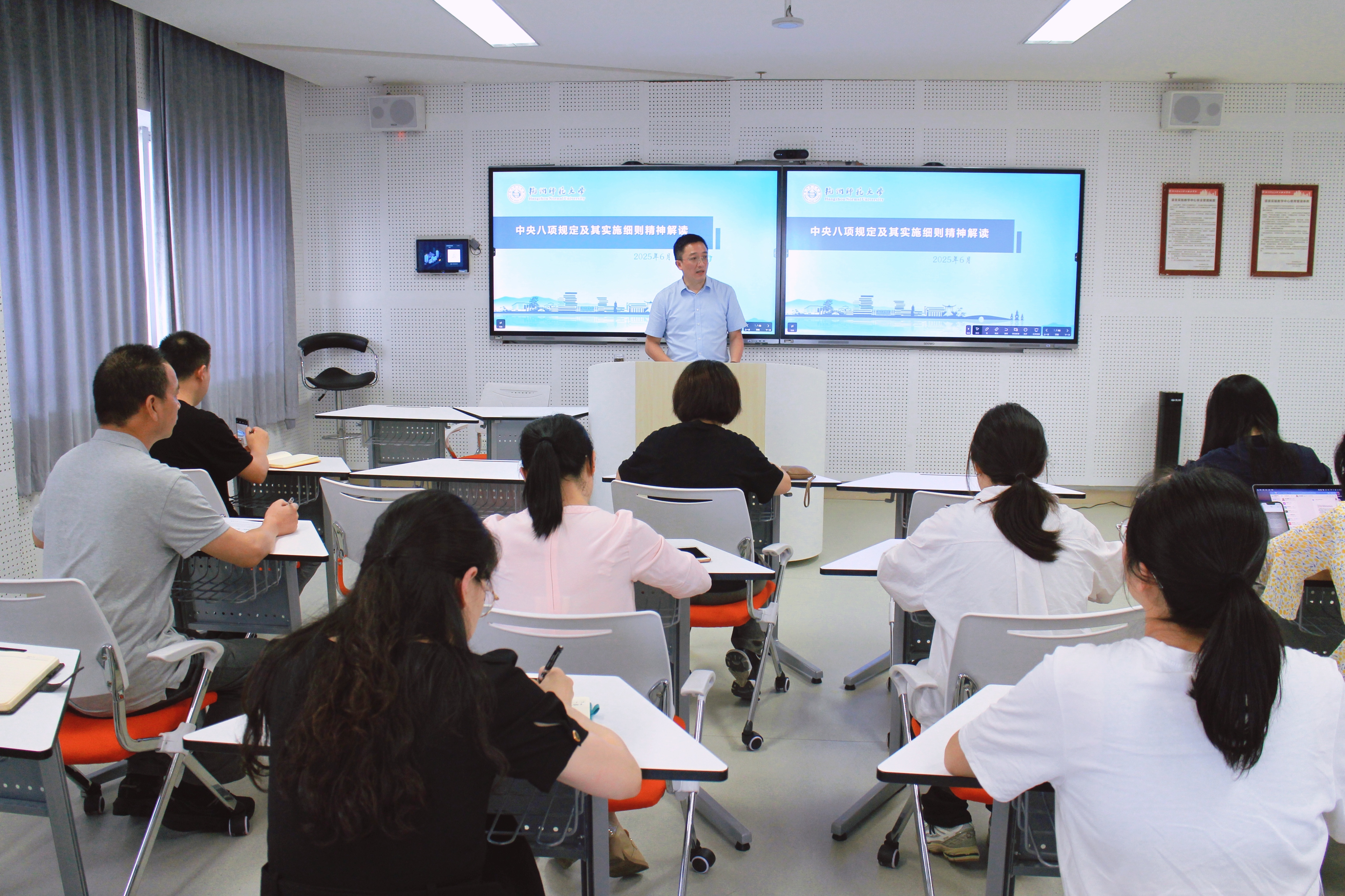 6月26日下午, 日本色情片 组织开展教职工政治理论学习,党委书记袁智杰以《中央八项规定及其实施细则精神解读》为题讲授专题党课,全体行政人员参加学习。