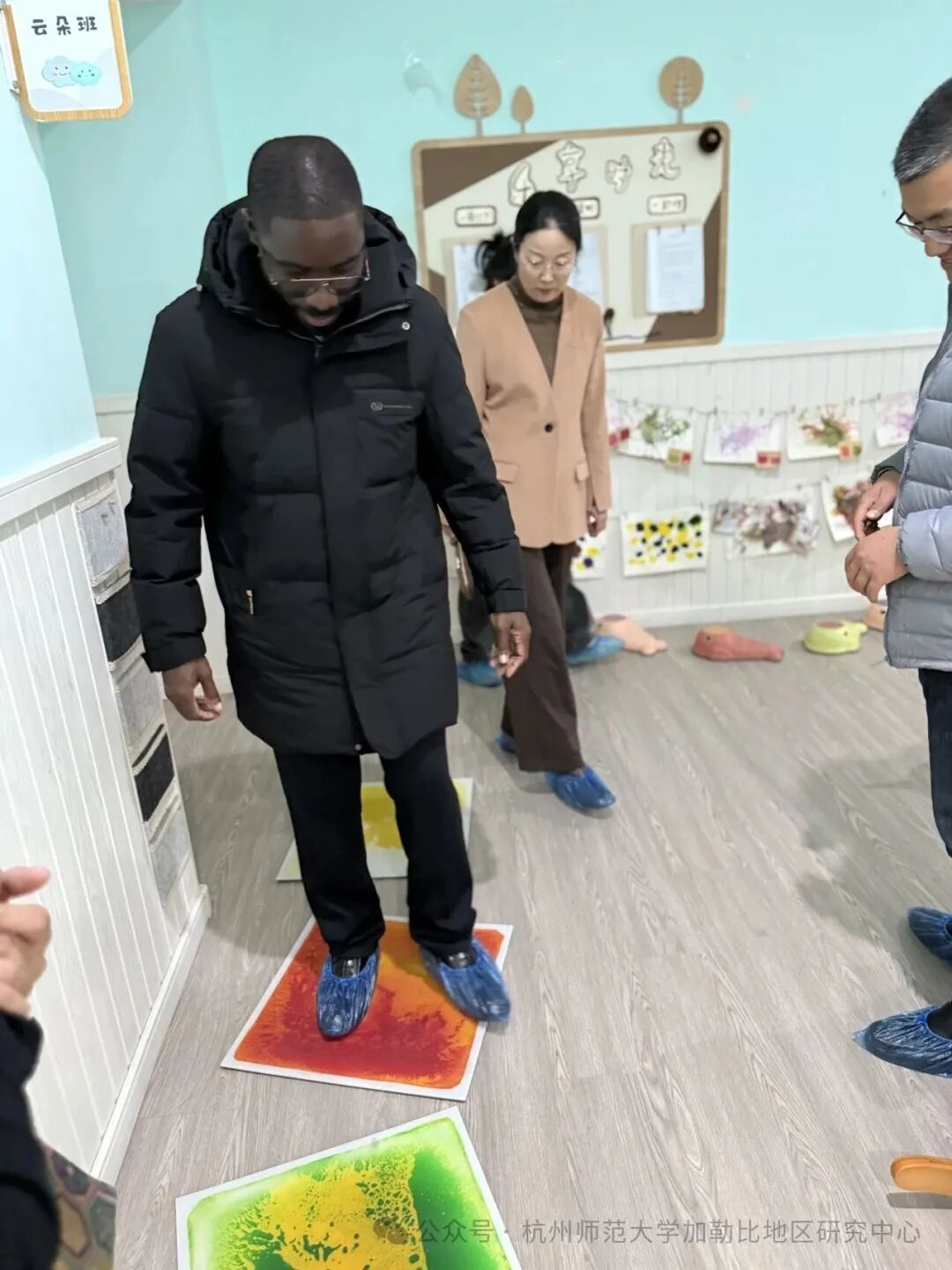 从奥尔夫音乐教室的专业教具到美术创意区的幼儿作品,Fearon教授不时驻足,亲手操作互动教学设备,询问各类教具的具体功能及其教育价值。