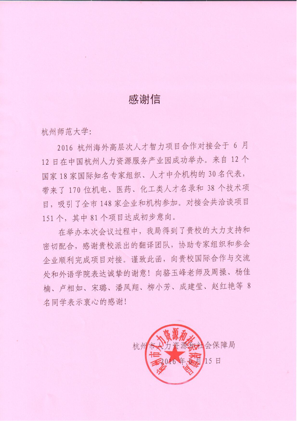 杭州市人力社保局发来感谢信