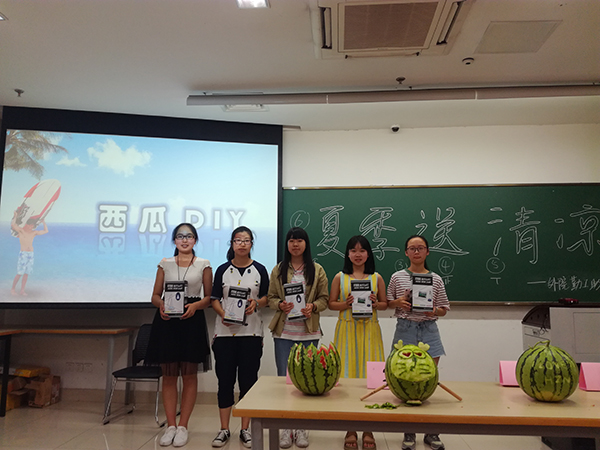 本次活动最令人印象深刻的就是装饰西瓜的环节,因为这一环节不仅考验了同学们的手工水平,而且要求同学们拥有团结合作的精神。一个个充满着创意的作品完成了,在决出胜利者之后,本次“夏季送清凉”活动在一场盛大的西瓜盛宴中落下了帷幕。