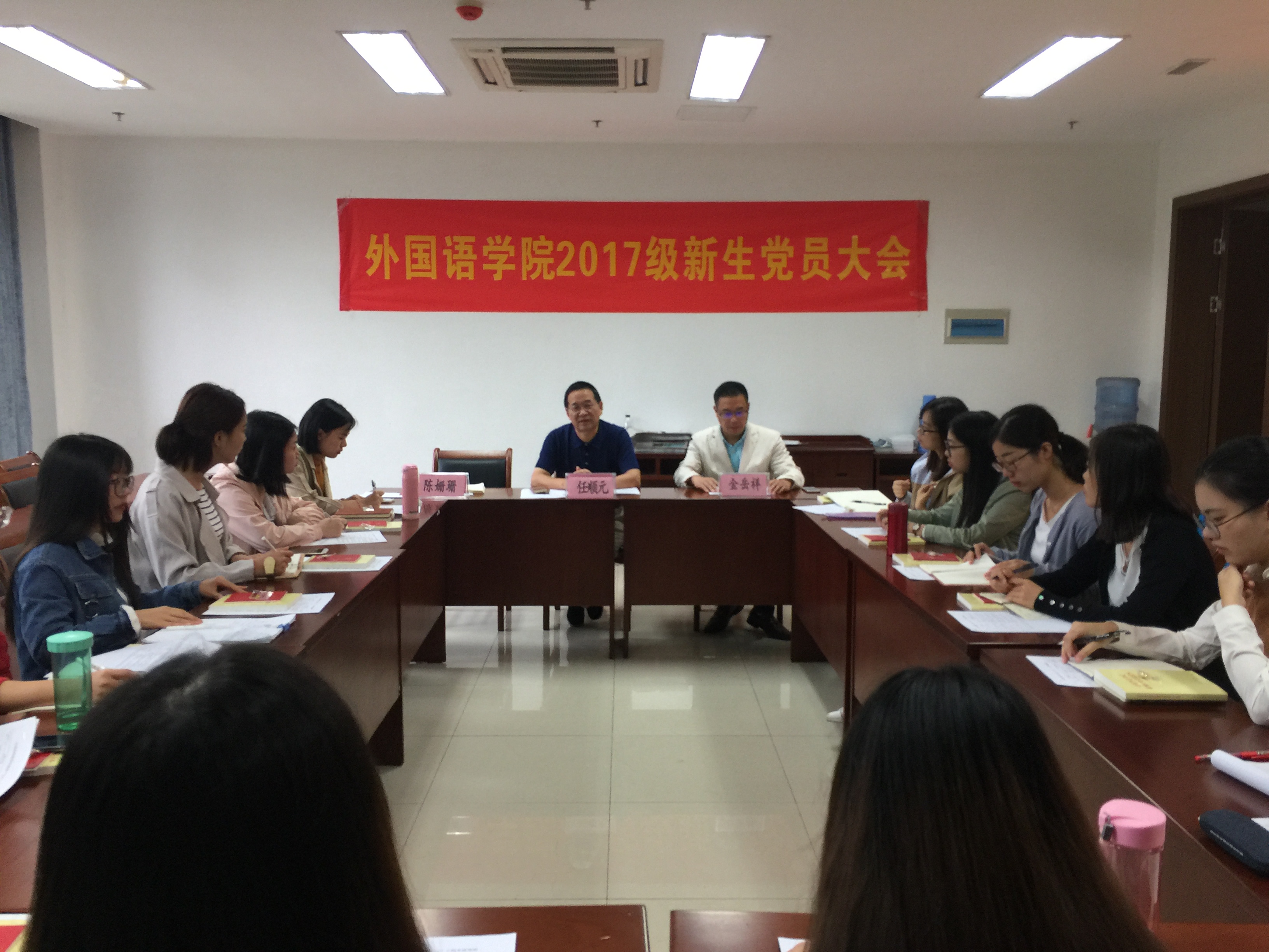 10月13日上午, 日本色情片 党委在恕园19-208举行2017级新生党员大会,党委书记任顺元、党委副书记金岳祥、研究生辅导员林祯昊出席会议。兼职组织员、团委书记陈姗珊主持会议。任书记和金书记向新生党员讲授“入学第一课”。