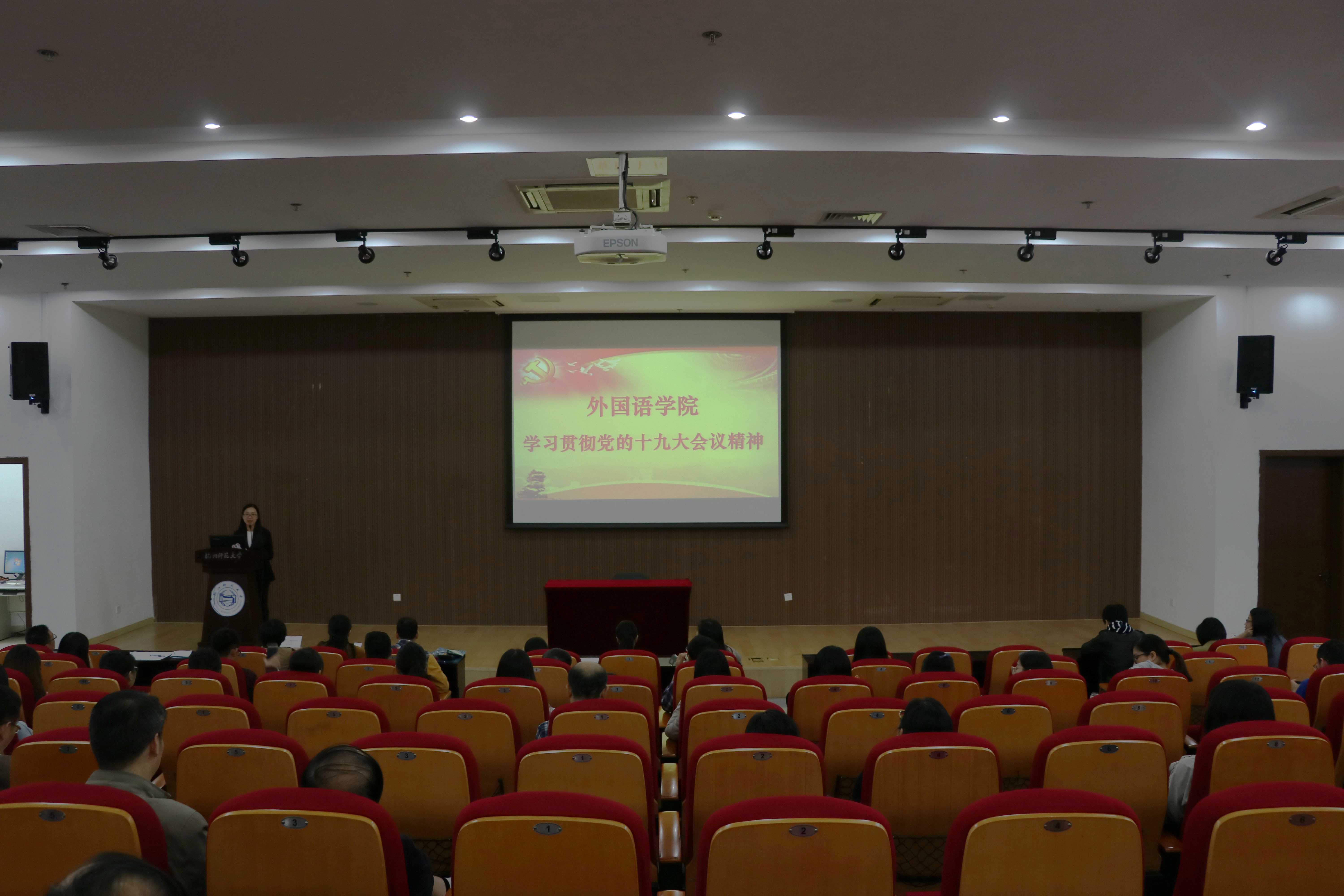 任书记对十九大报告中提出的新时代、新思想、新目标、新征程进行解读,并对下一阶段学习贯彻党的十九大会议精神具体要求进行部署,要求全体师生党员一定要把认真学习宣传贯彻十九大精神当成当前和今后一个时期学院的首要政治任务,各党支部要把学习宣传贯彻党的十九大会议精神纳入本月“党员固定活动日”重点学习内容。任书记指出,今年学院改革发展稳定的任务繁重,做好2017年学院各项工作,对于实现建设特色鲜明国内一流的外国语学院的奋斗目标,对于全面完成“十三五”时期的各项任务非常重要。
