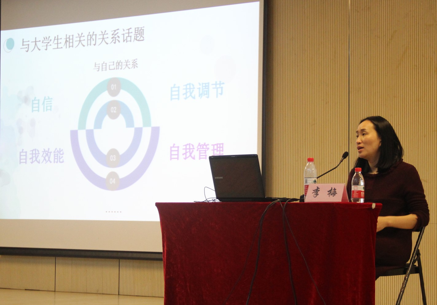 讲座主题为“从关系的视角谈心理健康”。李梅老师直切正题,向我们阐述了什么是心理健康问题,以及我们为什么要了解心理健康问题这两大核心内容。在关系视角切入,李老师讲到心理健康问题的教育是一种通识教育,并且心理与环境、社会、周人、和自己都关系都密不可分,心理健康问题与我们的身心生活息息相关。接下去,李梅老师结合实例指出,大学生常见的心理问题以恋爱问题和宿舍关系问题为多,并提出建议。摆正自己的心态,进行积极的心理暗示和调节、自我鼓励等等方式对于问题的解决和个人的成长具有重要意义。“希望同学们都能通过自我调节发挥自我效能,树立自我管理意识,合理安排大学生活,走出‘迷茫’、瞎忙’的无序生活。”李梅老师说道。