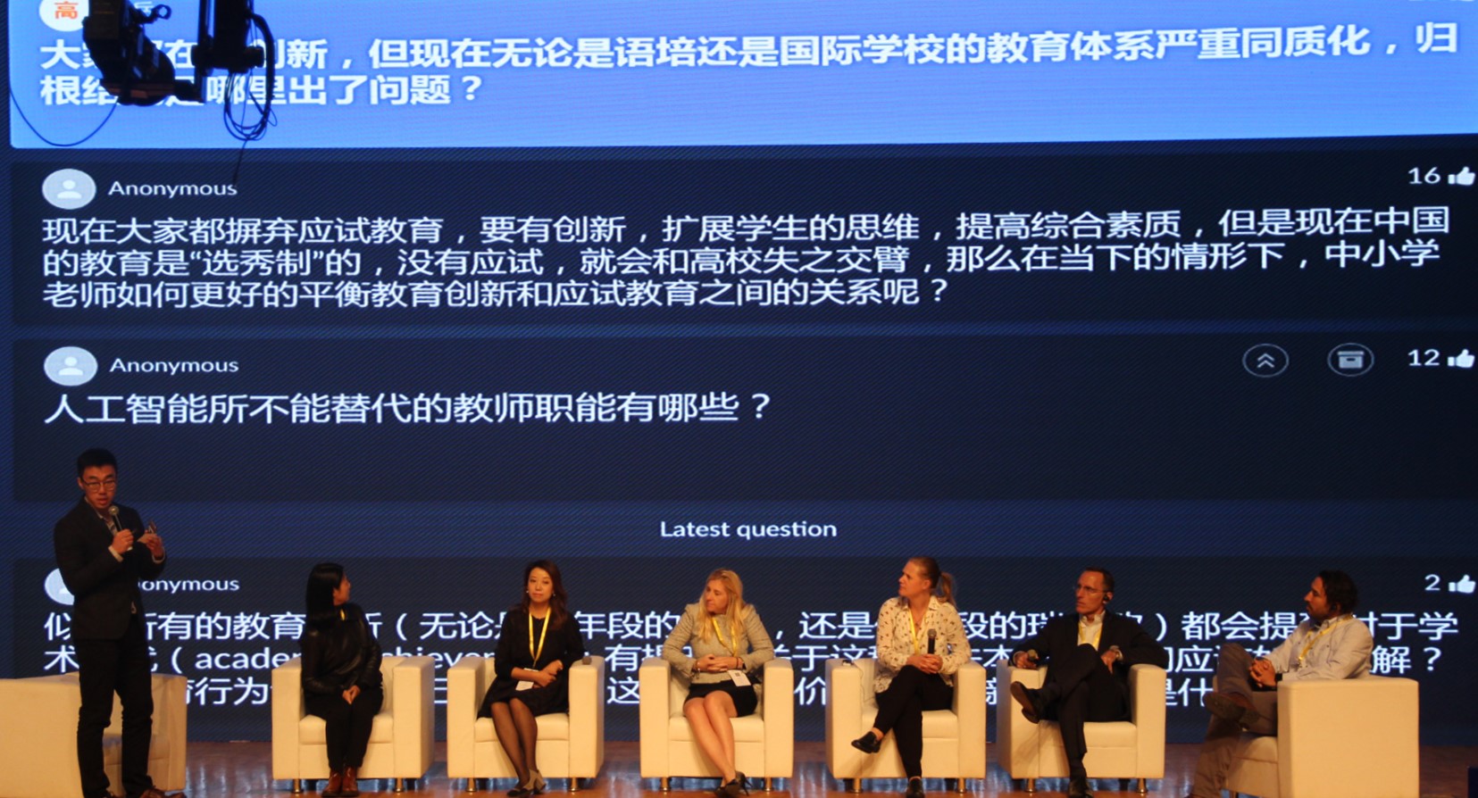 第一天,论坛进行了“嘉宾speaking”环节,场内业界大咖云集,思想激烈碰撞。期间,还进行了趣味十足的“你问我答”环节。外国语学院副院长李颖在发言过程中,列举了“狄德罗的外套”和“天马津云”两个典故作为开场白和结束语,就此向在座来宾提出了一个问题:当Internet来的时候,师者应该抱以什么态度?答案是毋庸置疑的,那就是“科技与教育相结合”。 新东方创始人俞敏洪虽遗憾地未能亲临现场,但他专门为本次活动录制了视频,分享他是如何看待教育这件事的。接着,乡村教师代表王静就“农村教育现状及挑战”提出“教师超编、制度待新、师者流动、教师压力”等现有的问题,引发在座嘉宾深思。