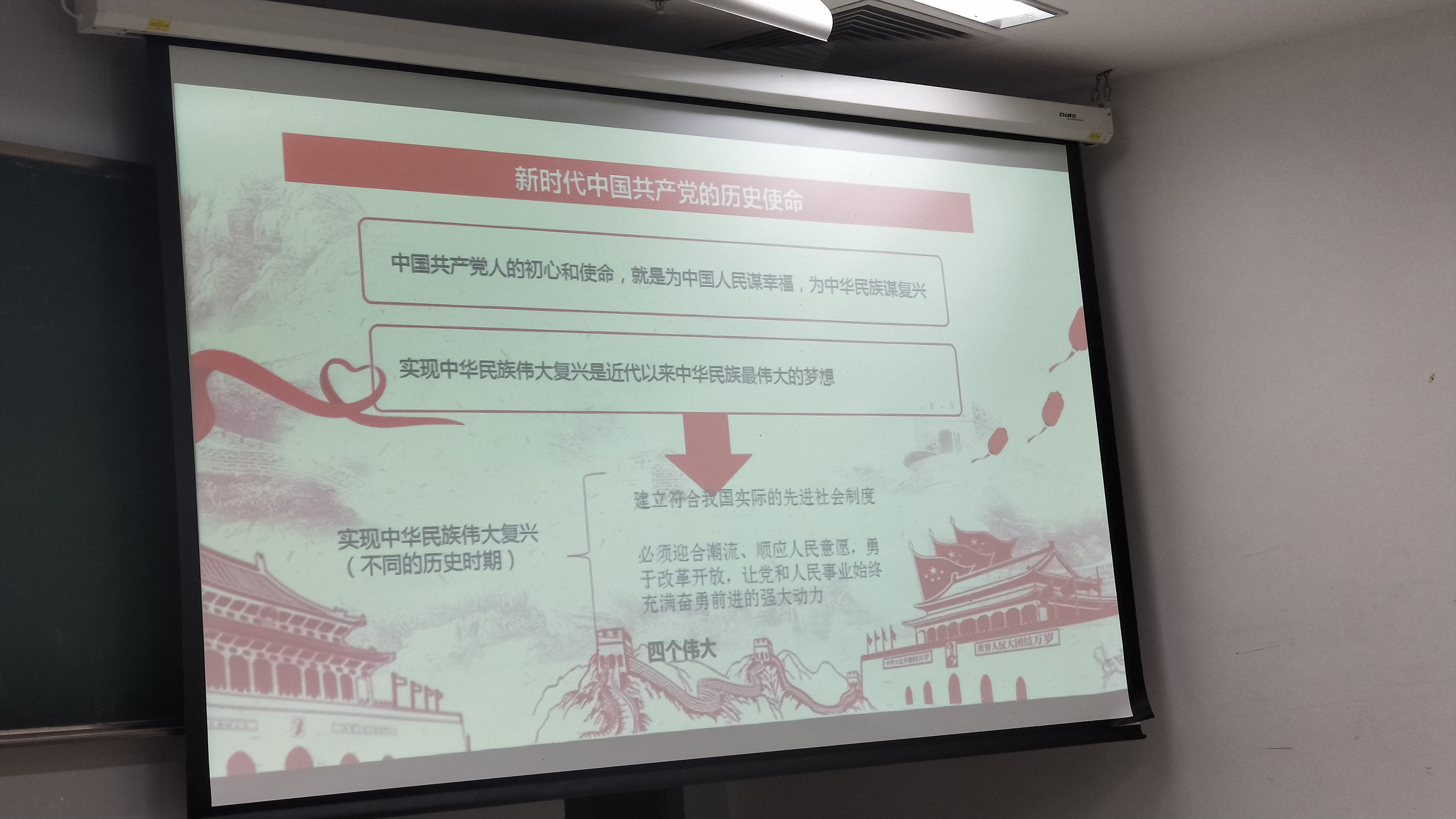 通过这次宣讲会,我们班同学更加深入了解了十九大提出的一些新思想和新战略,提高了同学们对党和国家发展的关注度,也从这次宣讲会更全面理解了十九大精神——“不忘初心、牢记使命”。中国共产党的使命是神圣的——为中国人民谋幸福,为中华民族谋复兴。在未来,作为新青年的我们会永远跟着党走,撸起袖子加油干!就像习近平总书记说的那样“我们就一定能走好我们这一代人的长征路。”