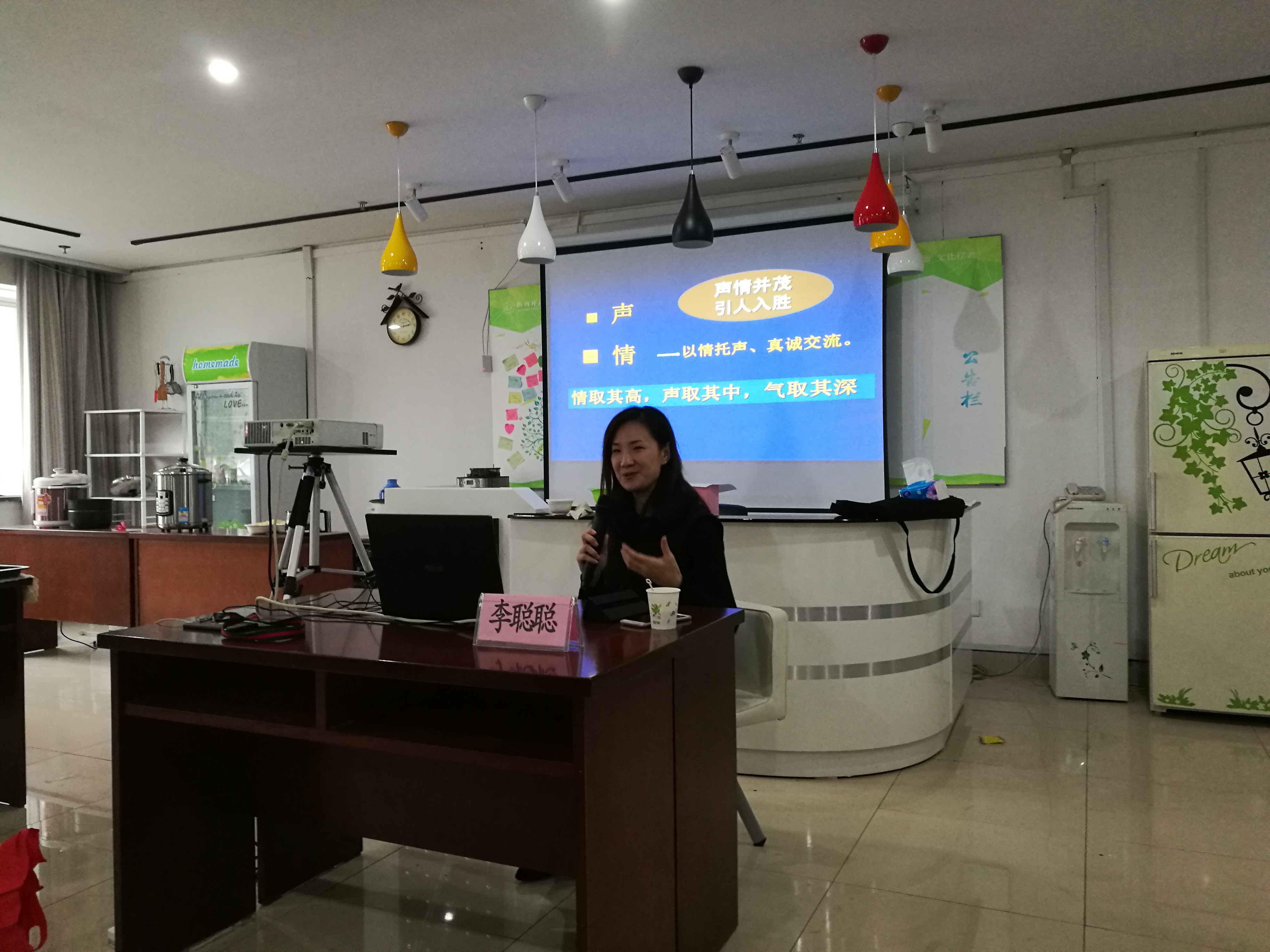 李聪聪老师就呼吸方法、发声方法、嗓音保健进行了讲授和训练。李老师音色优美,讲授内容丰富,声情并茂,不仅从理论上阐释了科学发声可以保持声音的永久完美,还结合教师上课的实际需求,介绍了呼吸、开喉、共鸣等行之有效的锻炼气息、放松声带的小窍门,在讲座中李老师还带领大家就修复嗓音和治疗嗓音疾病进行了保健练习,用绕口令、口部操等现场进行示范和训练,并对在场的老师进行逐一指导。