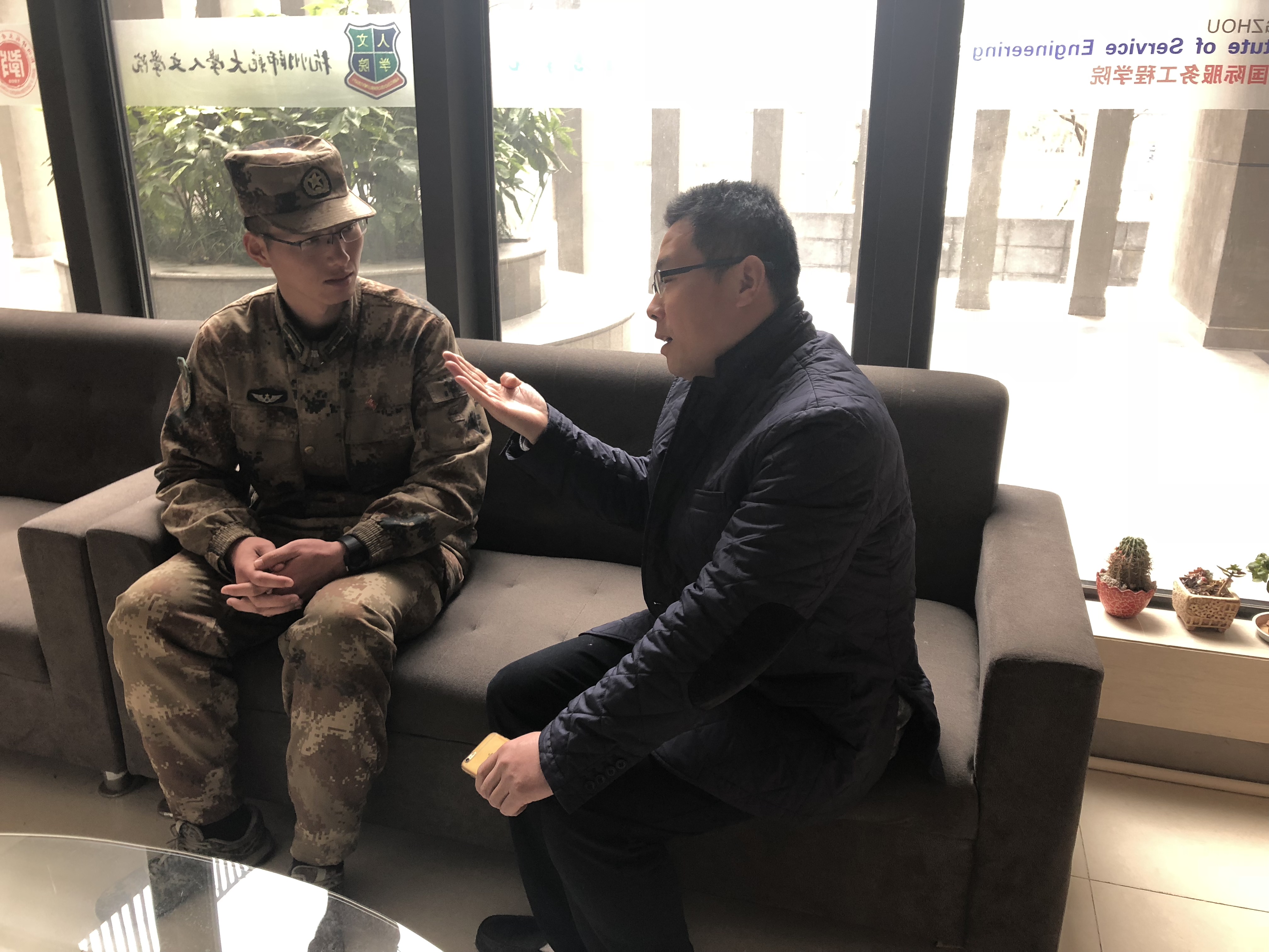 2018年1月16日中午12点,外国语学院党委副书记金岳祥、学生工作办公室主任钱珊、团委书记陈姗珊、团委副书记林祯昊和17级新生辅导员张高娃老师一行代表学院赴博文苑6号楼看望和慰问军训教官。