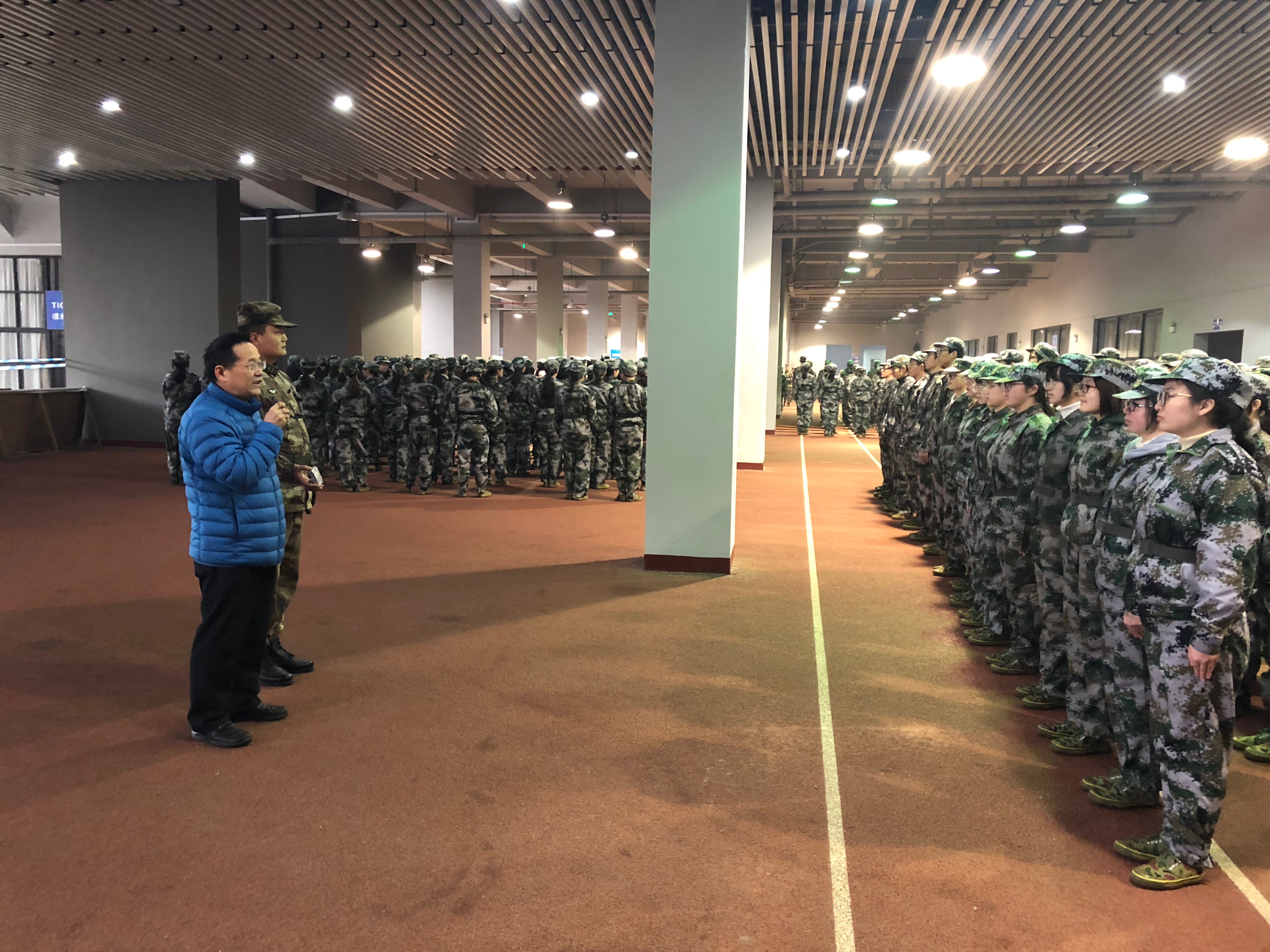 1月21日上午,冬雨绵绵, 日本色情片 党委书记任顺元在辅导员的陪同下,来到体育馆军训训练场地,慰问2017级军训学生。