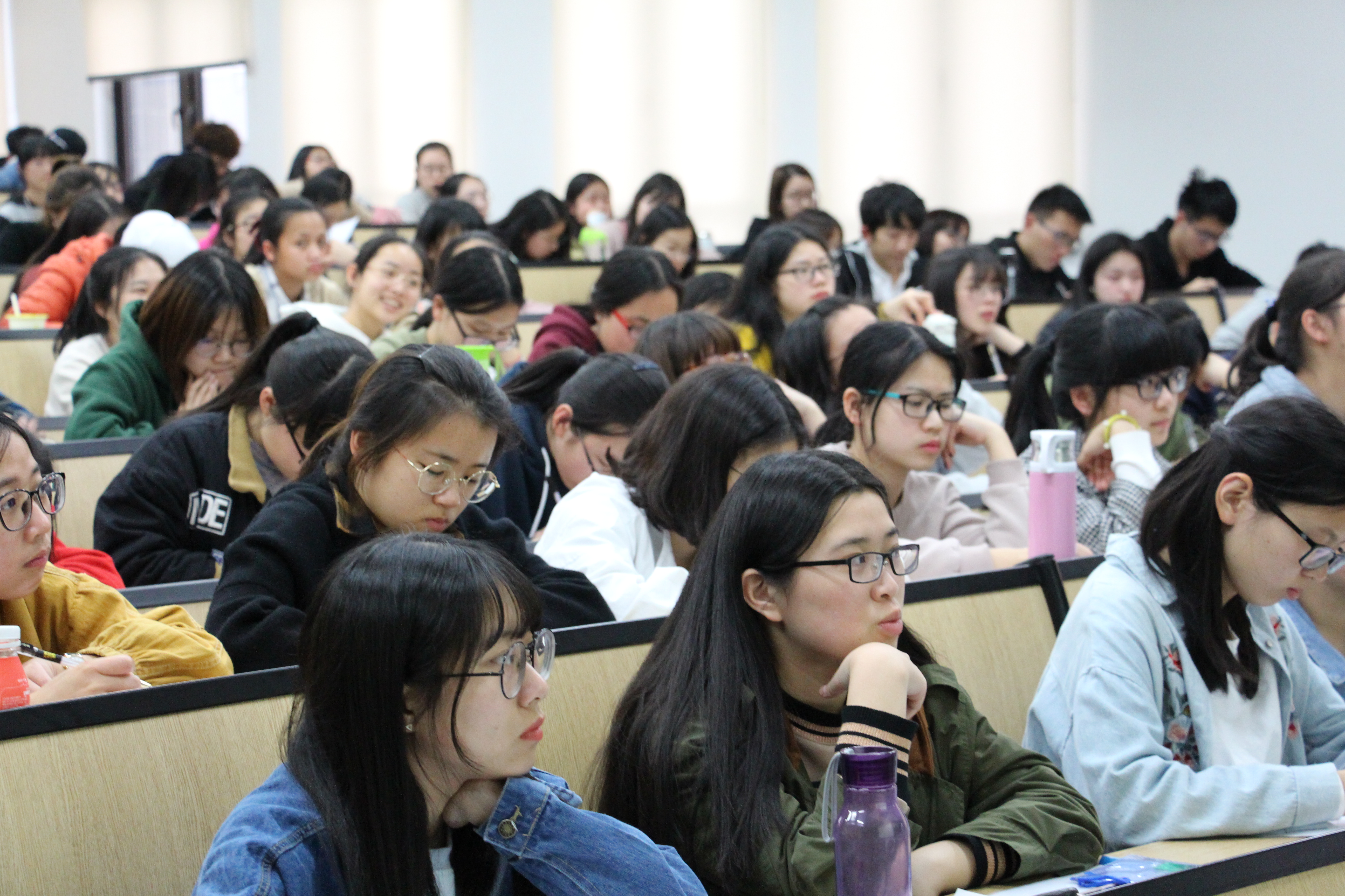 讲座还未开始,现场已是座无虚席。接着,王忻老师走上讲台,在幽默风趣的一番自我介绍之后,开始了讲座。王老师从何为认知语言学入手讲解。他从“心寓于身”、“隐喻”、“转喻”、“构式”等方面入手,借日语中的“烤鸡肉”、“爱喝酒的人”等例子,详细地解释了一番何为认知语言学,使同学们对此有了一个初步的认识。接着,王忻老师将认知语言学同日语学习“态”范畴的偏误与识解相联系,着重讲解了被动态、使役态、可能态三种语态中容易出现的偏误,同时也告诉了同学们语态的正确使用方法,同学们也纷纷点头表示赞同。