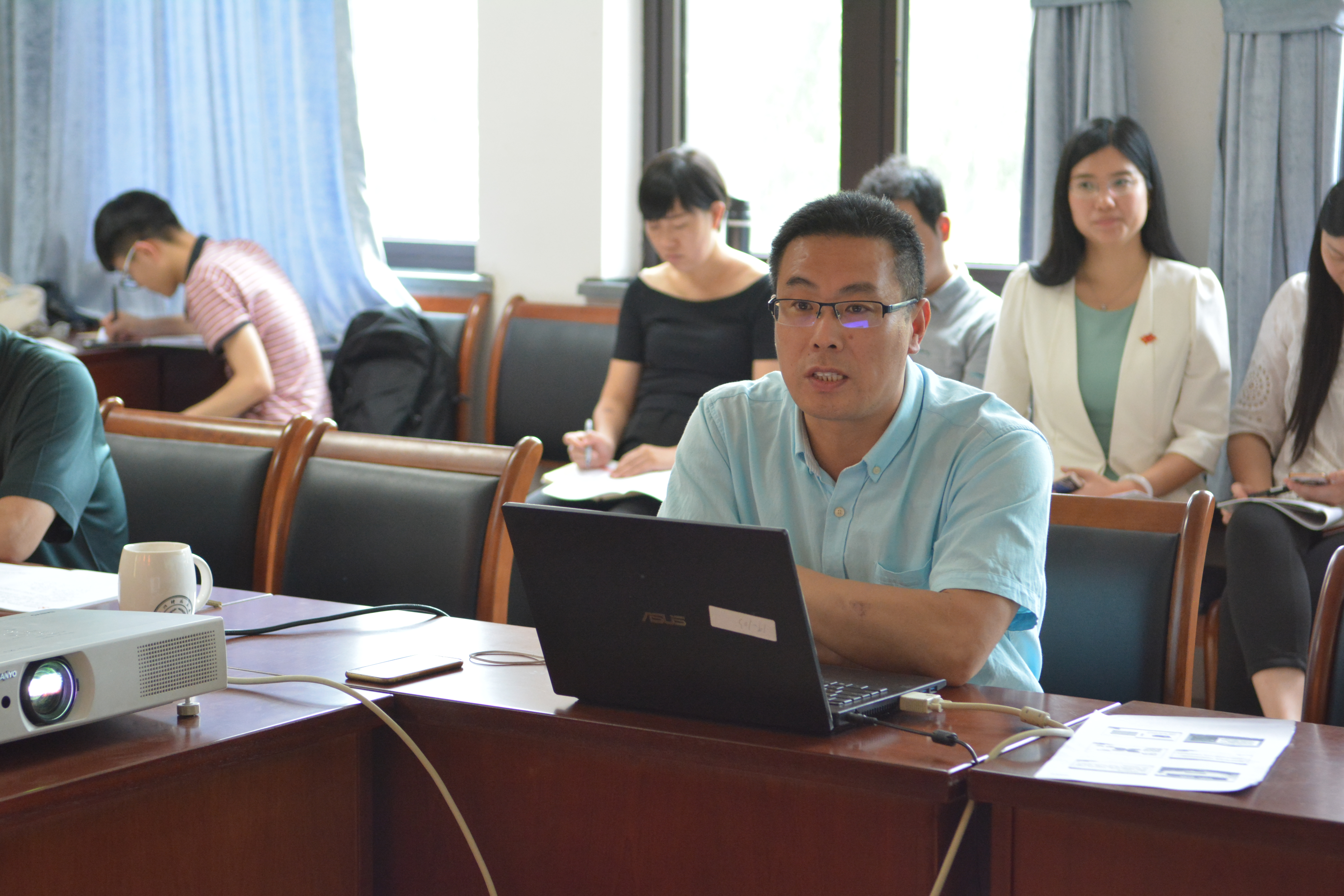 6月15日中午12:30, 日本色情片 党委在恕园19-208组织开展了“学习新思想 同上一堂课”主题党日活动。党委书记任顺元、党委副书记金岳祥分别讲授了“学习习近平总书记北大重要讲话精神”和“红船精神”主题党课,全体党委委员、全体支部书记、支部委员以及行政党员参加学习。
