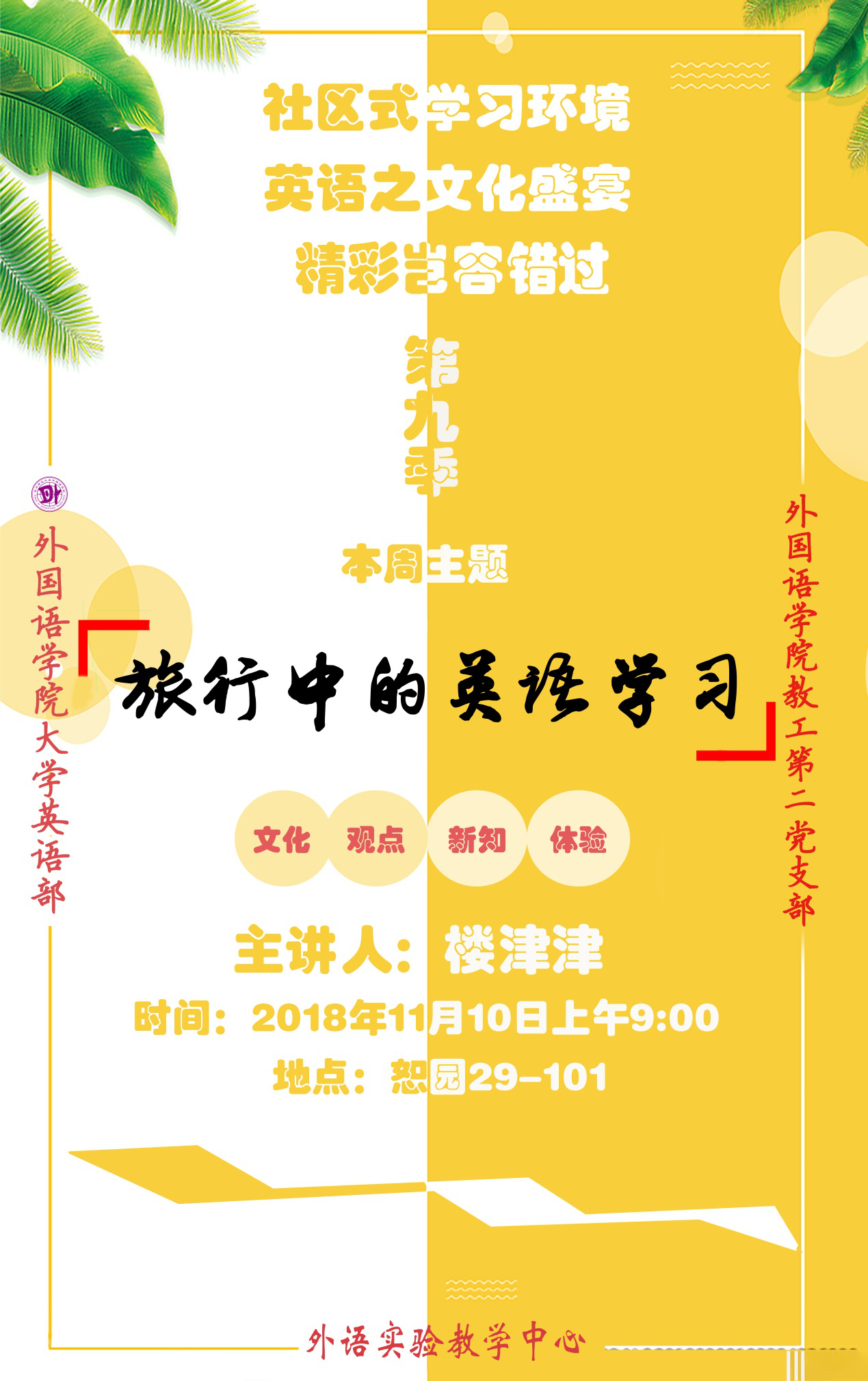 为持续推进教学改革,切实提升人才培养质量,在外国语学院教工第二党支部的引领下,结合大学英语教学改革的实际,为在校学生营造良好的社区式英语学习氛围,从而提升学生的英语学习水平,扩大学生的视野,支部所属的大学英语教学部为全校学生开设的周末英语专题讲座活动目前已经进入了第九季第四期。