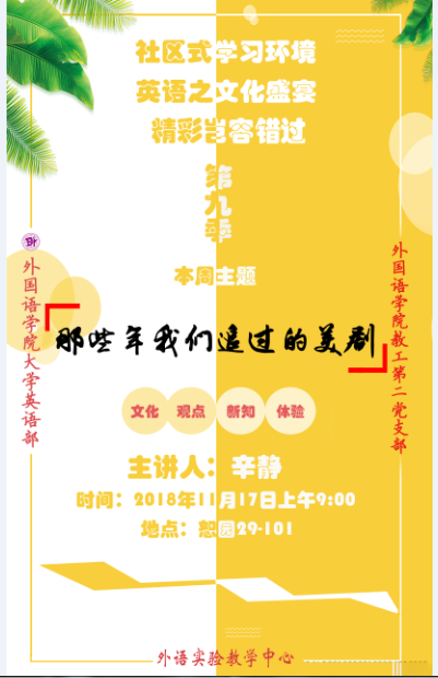 2018年11月17日,周六,气温骤降,不过好学的学子依然纷至沓来,大约50名同学全程参与了辛静老师的“那些年我们追过的美剧”周末学习讲座。讲座从学生感兴趣的美剧讲起,介绍了美剧的相关知识,包括美剧在中国传播的四个阶段,美国电视节目的分级制度,美国的电视网和流媒体,美剧关键词(如rating, season, episode, prime, timeslot, pilot, focus group, premiere, finale等),美剧的分类,以及美国艾美奖。辛老师和同学们分享了字幕组的经历,加深了同学们对美剧背后英语爱好者--字幕组的运作的了解。最后,辛老师对如何利用美剧来学习英语给出了一些可行的建议,学生们深感受益匪浅。