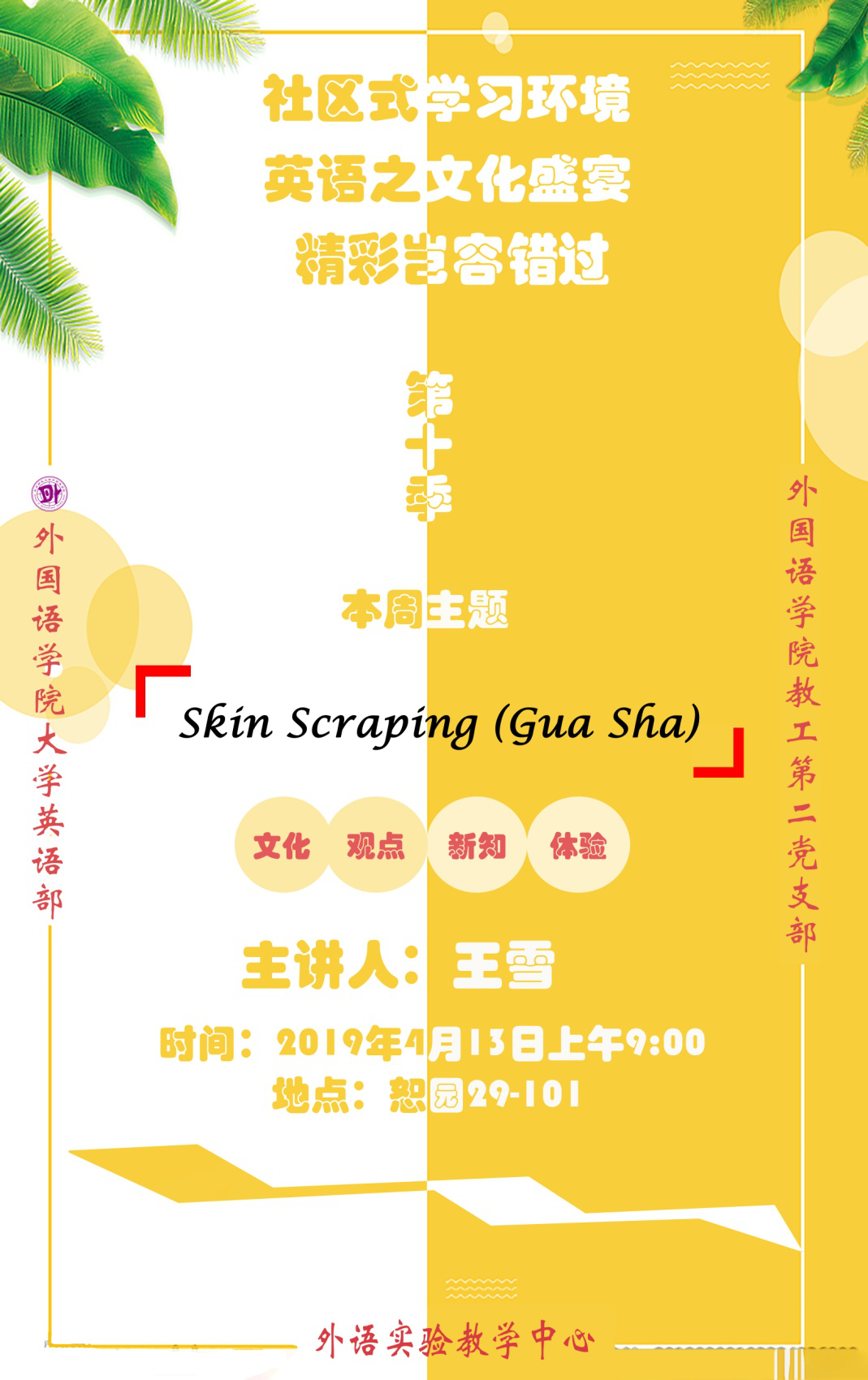 在外国语学院教工第二党支部的引领下,结合大学英语教学改革的实际,为在校学生营造良好的社区式英语学习氛围,从而提升学生的英语学习水平,扩大学生的视野,支部所属的大学英语教学部为全校学生开设的周末英语专题讲座活动目前已经进入了第十季第四期。