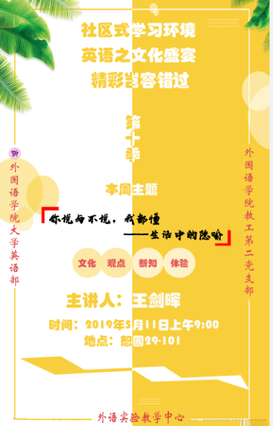 在外国语学院教工第二党支部的引领下,结合大学英语教学改革的实际,为在校学生营造良好的社区式英语学习氛围,从而提升学生的英语学习水平,扩大学生的视野,支部所属的大学英语教学部为全校学生开设的周末英语专题讲座活动目前已经进入了第十季第七期。