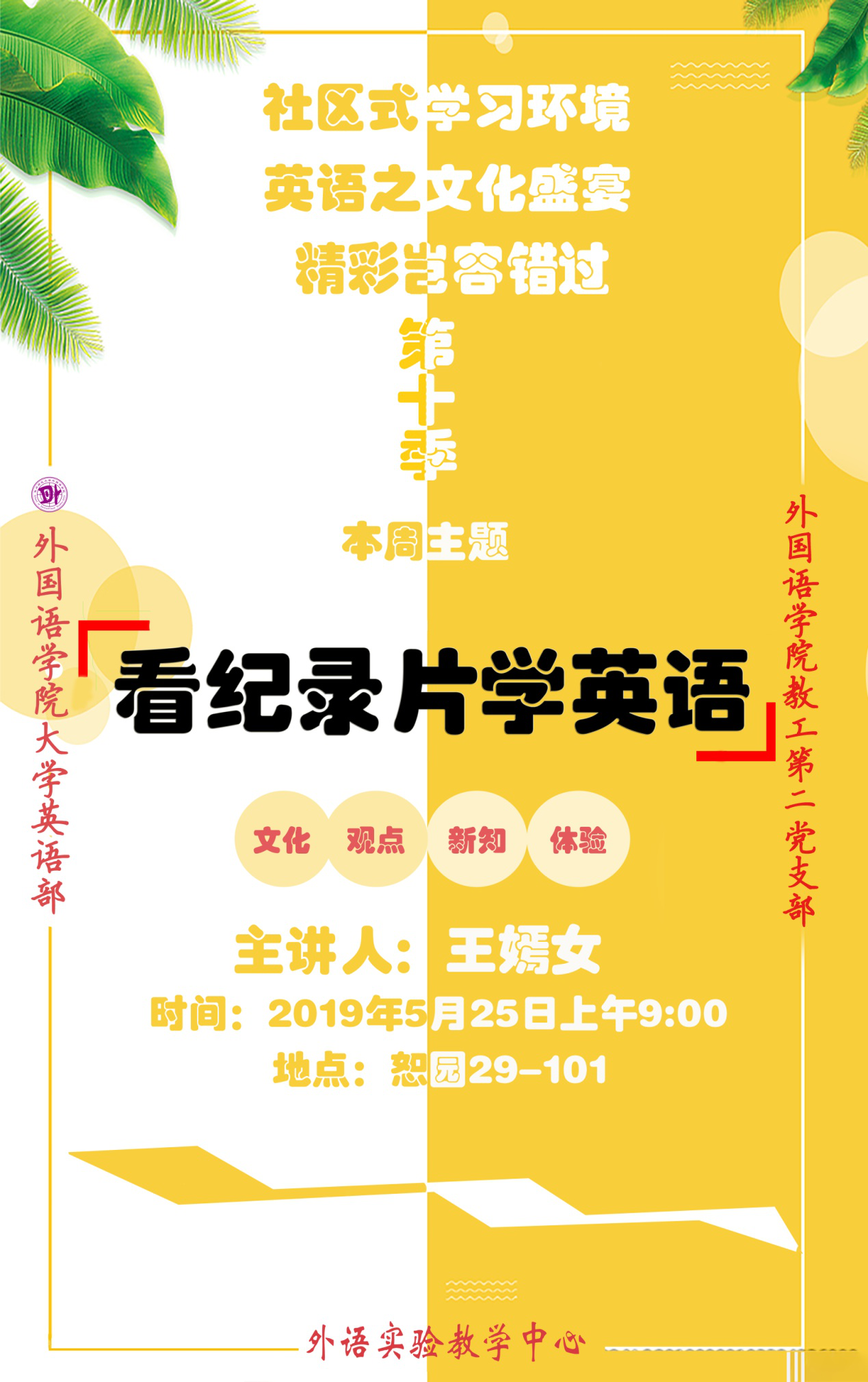 2019年5月25日周六,大学英语部的王嫣女老师特意为同学带来了“看纪录片学英语”的精彩讲座。制作精良、发音优美的纪录片是学习语言的极佳材料。本次讲座从探讨纪录片的定义入手,向学生详细地介绍了纪录片正确的打开方式;同时,通过推荐各类主题的优质纪录片,提醒学生应该谨慎看待纪录片中所谓的各种“事实真相”;最后,以两则关于“哈里和梅根的混血宝宝”的新闻报道和相关英国王室纪录片为例,建议学生根据自己的兴趣点,结合新闻报道、电视剧等视听材料,带着问题去选择纪录片,在观看的过程中解决已有的问题,同时发现新的问题并深入钻研,从而在提高自己的英语听、说、读、写、译等能力的同时,提高自己的批判性思维能力。由于临近期末考试季,本次参加讲座的同学不多,大概20来位,不过参加的同学都表示听了讲座后,深受启发。