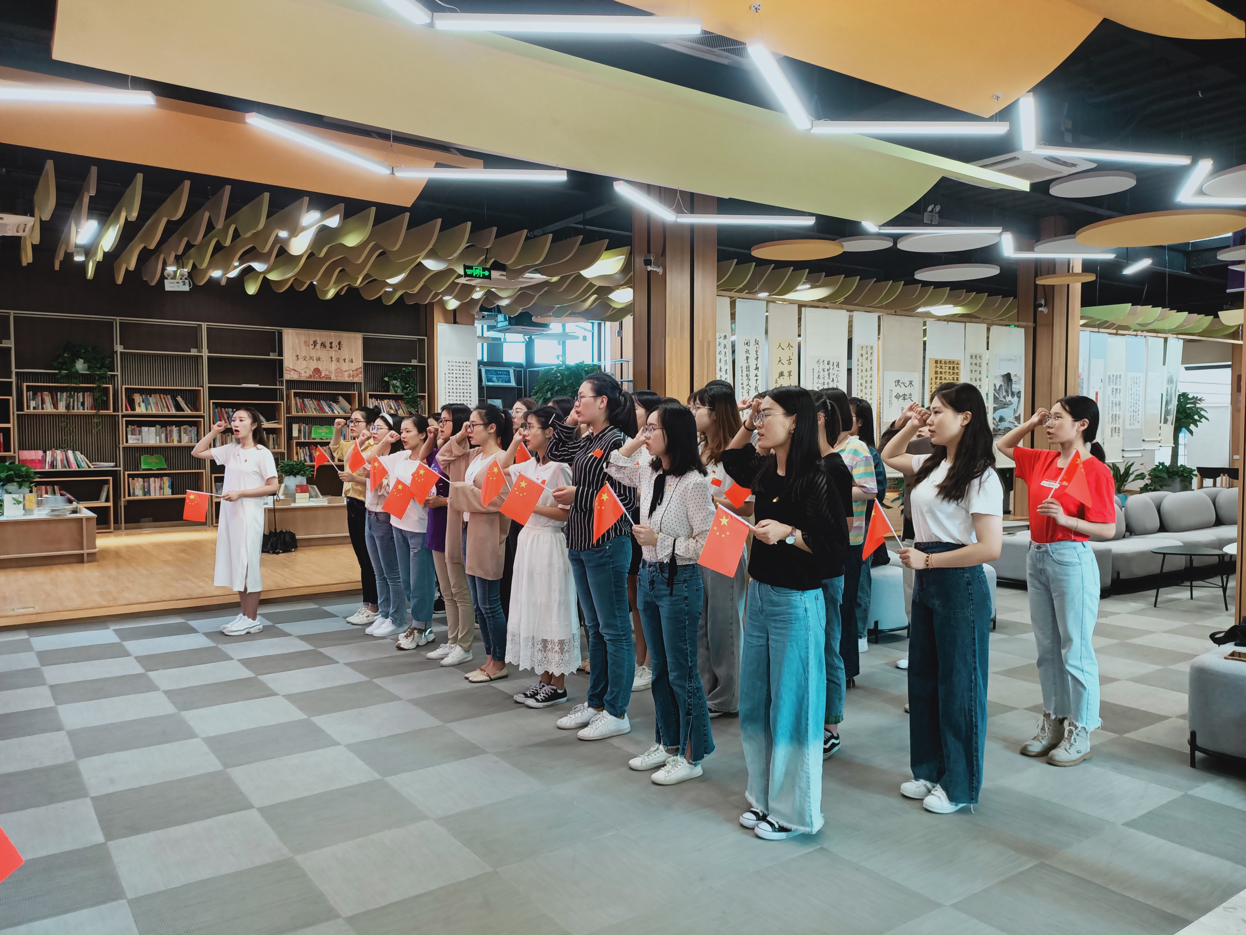 在学院党委的有序组织下,学生党员统一佩戴党徽,一同前往乾仓党群服务中心,参观体验“初心红仓”。在入党宣誓墙前,学生党员昂首挺胸,紧握右拳,一起重温了入党誓词,铮铮誓言,是每一位党员不忘的初心;灼灼目光,是每一位党员坚定的信念。在影音厅,学生党员观看了革命老兵张富清同志先进事迹宣传片。随后,党员们挥动五星红旗一同合唱革命红歌《团结就是力量》。在振奋人心的旋律中,党员们感受到了革命先辈艰苦卓绝的战斗精神和万众一心的革命力量。在VR体验区,党员们还通过VR技术重走长征路,亲身体验当时红军万里长征路上爬雪山、过草地、救助伤员的重重困难。最后,各个党支部在党旗和国旗前打卡合影,以此谨记初心,牢记使命,开创未来。