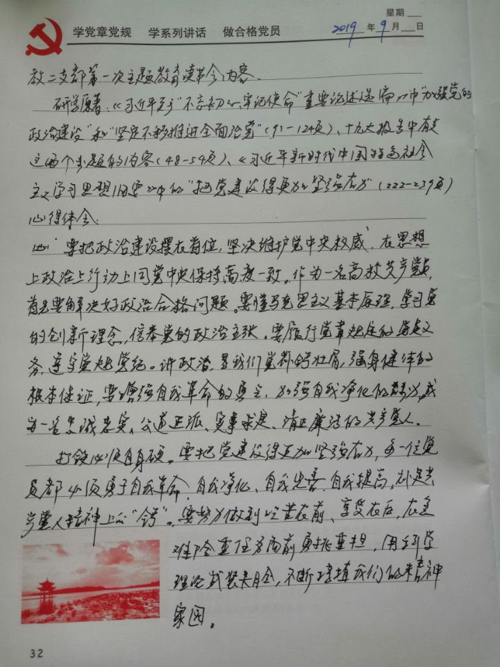 2019年9月23日和9月30日,支部书记卢美艳老师与全体支部党员一起学习了《习近平关于“不忘初心、牢记使命”重要论述选编》中的“加强党的政治建设”和“坚定不移推进全面从严治党”(91-124页)、十九大报告中有关这两个专题的内容(48-54页)、《习近平新时代中国特色社会主义学习思想纲要》中的“把党建设得更加坚强有力”(222-239页);和《习近平关于“不忘初心、牢记使命”论述摘编》中的“坚持群众路线,落实具体行动”(125-146页)、爱国主义教育主题学习(内容见群分享)、《习近平新时代中国特色社会主义学习思想纲要》中的“掌握马克思主义思想方法和工作方法”(241-252页)等内容,并相邀一起观看10月1日国庆70周年庆祝活动。10月1日当天,教二支部党员不约而同守在电视机旁,国庆观礼的同时纷纷表示为祖国自豪、为祖国点赞,并自发在微信朋友圈分享激动心情,勉励自己不忘初心、牢记使命,更好地肩负起一名党员教师的责任。