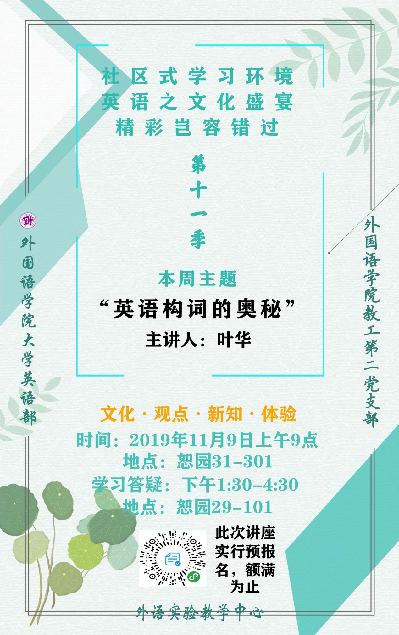 2019年11月9日,大学英语部的叶华老师做了题为“英语构词的奥秘”的讲座。叶老师从语言的经济性原则入手,介绍了现代英语中主要的构词法,并结合实例分析,引导学生关注构词法在语言学习中的作用,尤其是词根词缀在词汇学习中的多种应用。讲座后有多名同学向老师探讨如何科学背单词以快速扩大英语词汇量,得到叶老师的耐心解答后,同学们对背单词产生了新的兴趣和自信。