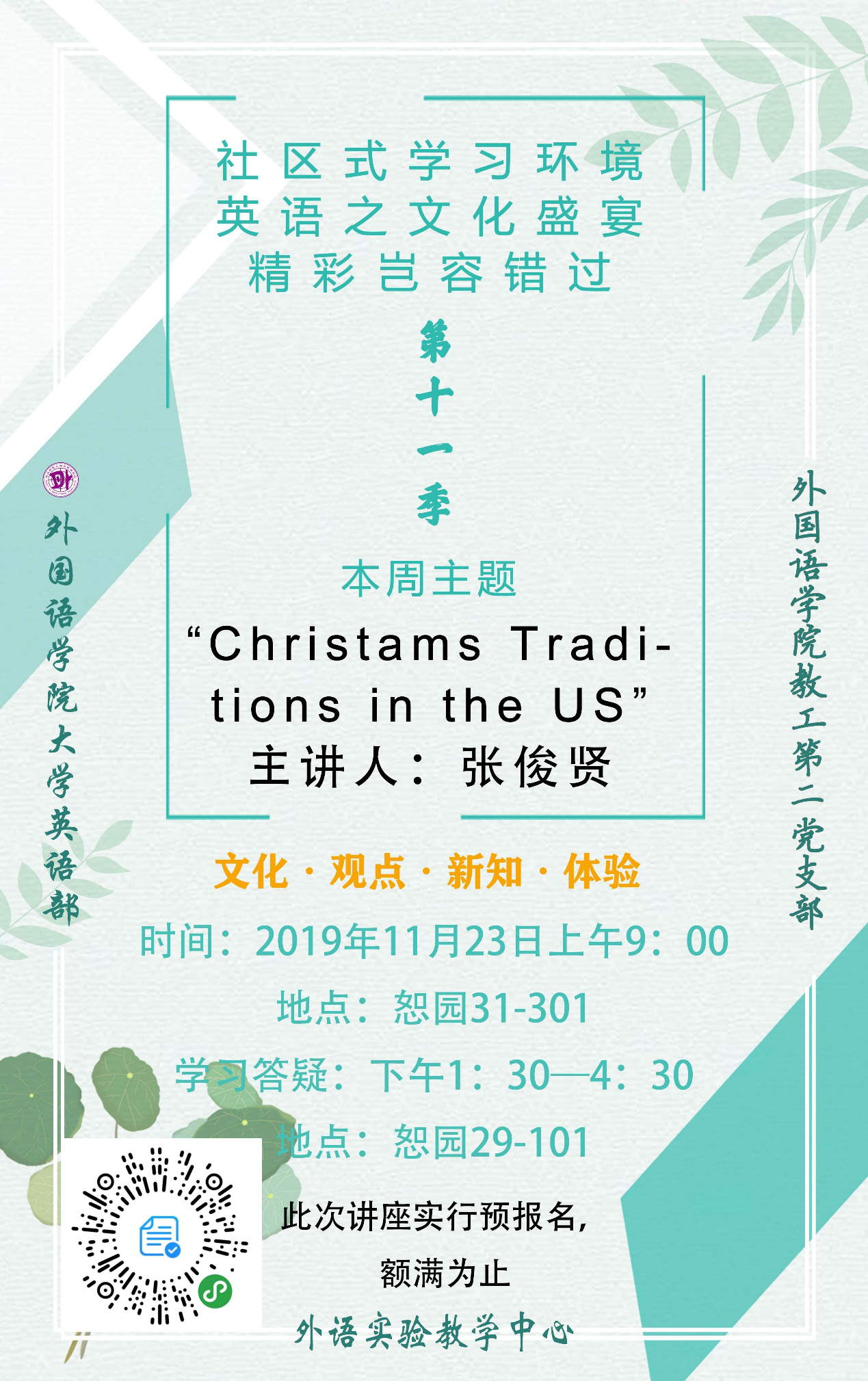 在外国语学院教工第二党支部的引领下,结合大学英语教学改革的实际,“不忘初心 牢记使命”,为在校学生营造良好的社区式英语学习氛围,从而提升学生的英语学习水平,扩大学生的视野,支部所属的大学英语教学部为全校学生开设的周末英语专题讲座活动目前已经进入了第十一季第六期。