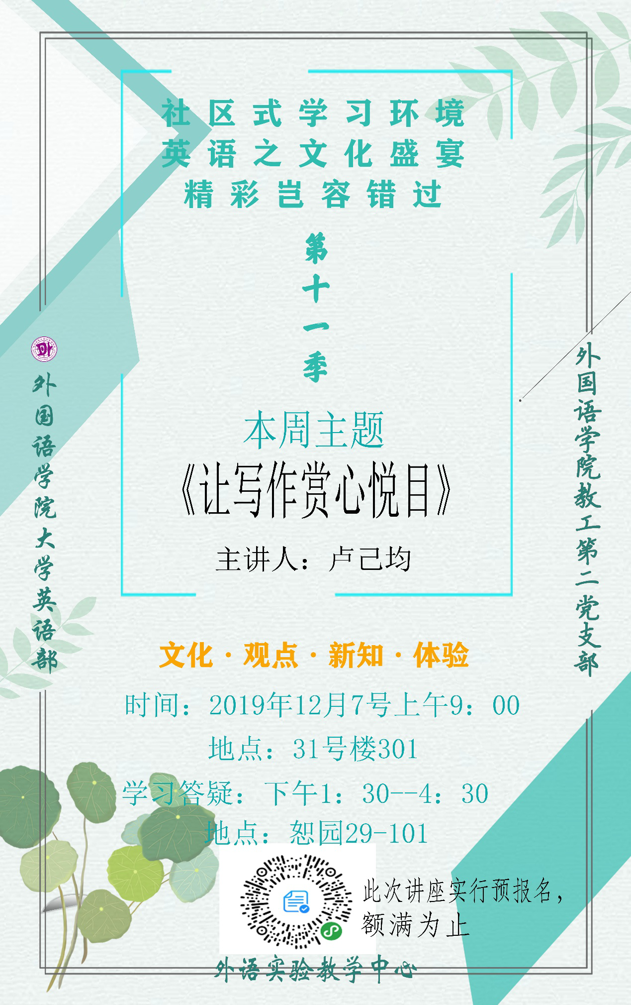 在外国语学院教工第二党支部的引领下,结合大学英语教学改革的实际,“不忘初心、牢记使命”,为在校学生营造良好的社区式英语学习氛围,从而提升学生的英语学习水平,扩大学生的视野,支部所属的大学英语教学部为全校学生开设的周末英语专题讲座活动目前已经进入了第十一季第八期。