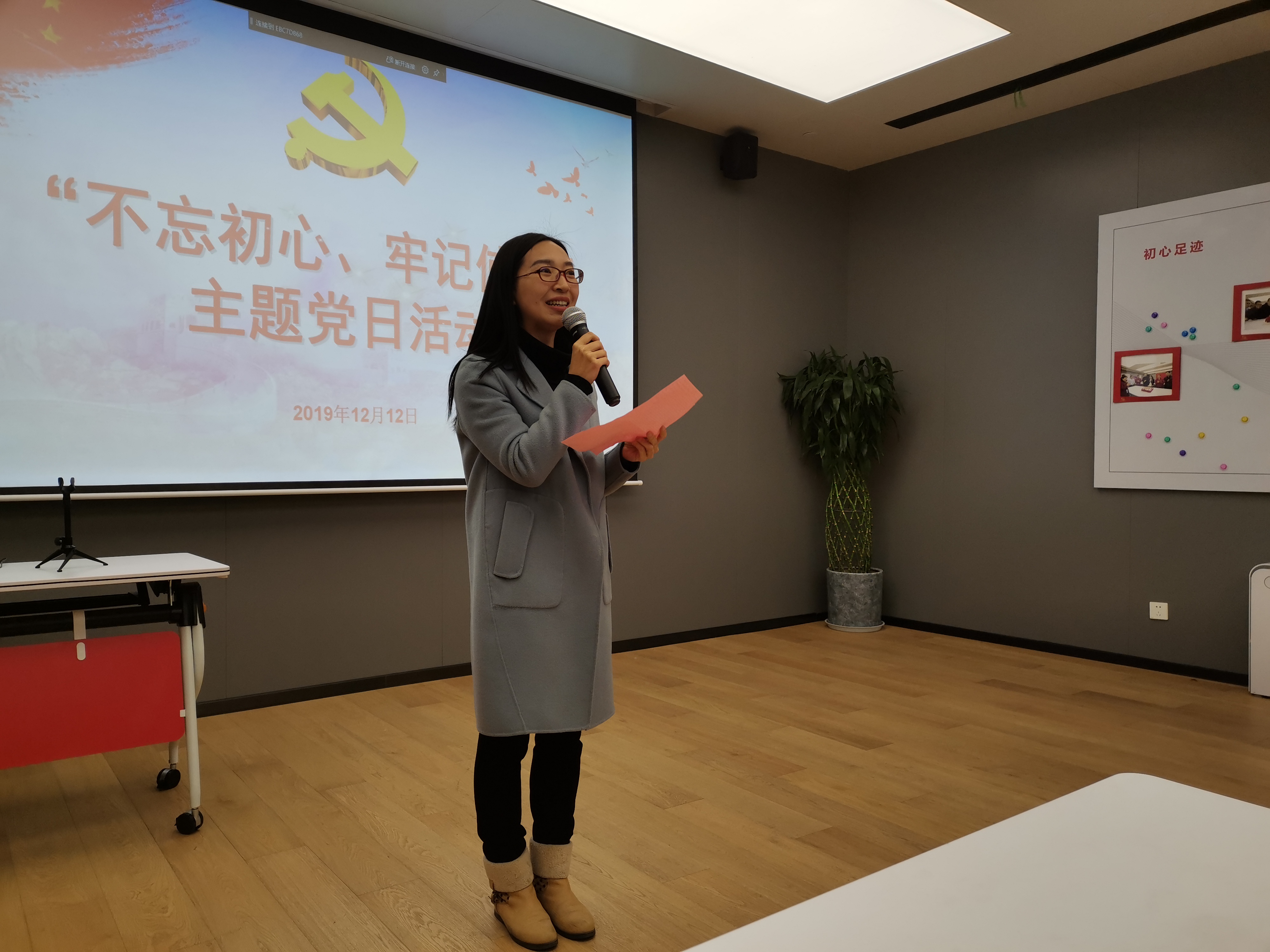 在观看党的十九届四中全会短片后,钱珊老师带领大家诵读《初心照亮使命》。