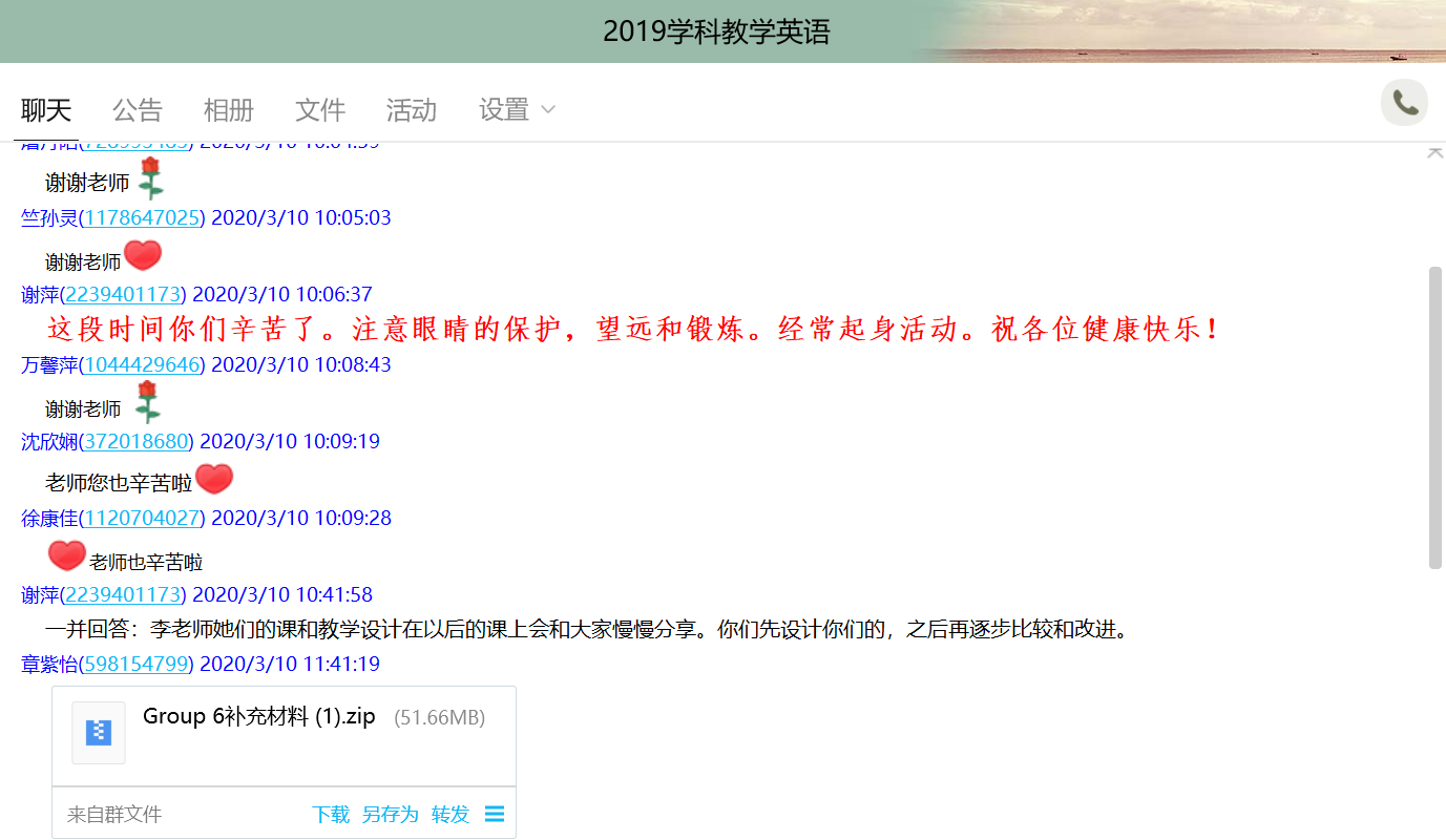 同学们纷纷给出了五星好评后,也指出了一些问题所在。网络直播受网速影响较大,有时会出现卡断或延迟的现象。而且比起真实课堂,线上教学缺乏一种上课的仪式感,师生间缺乏眼神各方面的交流等不利于拉近师生之间的距离。尽管云课堂存在一些不便,但是同学们依旧保持着对学习的热情,热烈响应。期待春暖花开时,我们相遇在师大的春天里!