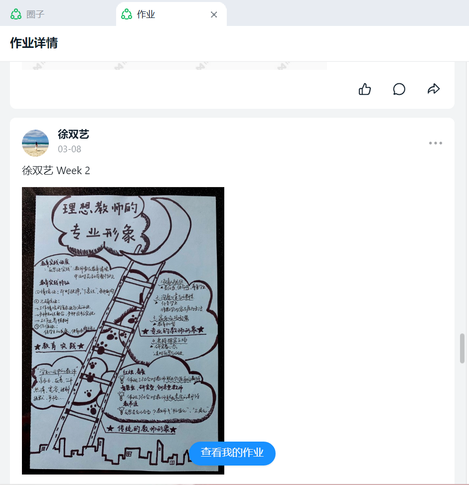 许慧婷同学认为,“线上学习平台使讨论内容得以有效展示与保存。钉钉上的作业分享使我们有机会学习优秀作品,进行对比反思,甚至可以像‘朋友圈’一样为同伴们点赞评论。”