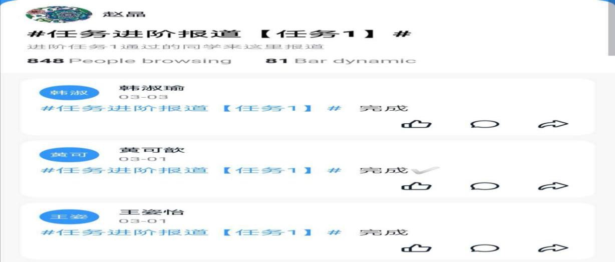 虽然是第一次上网课,但是法语老师充分利用了线上课堂的优势,提高了我们对法语学习的热情。赵晶老师会在法语学习圈发布进阶任务,任务由简到难。就像升级打怪一般,只有通过任务一,才能领取下一个任务,在这个过程中我们的“段位”越来越高,能力越来越强,对法语学习充满了兴趣。另外,我们每个人都可以在圈子里表达自己的观点,提出困惑,还可以反复的回放理解知识点。