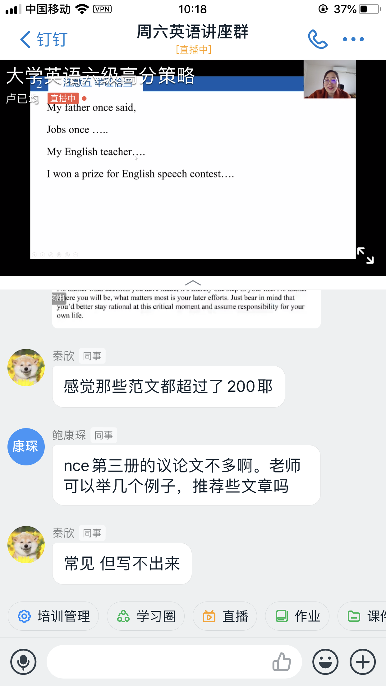 2020年3月14日,大学外语部的卢已均老师以“大学英语六级写作高分策略”为主题,正式拉开第十二季“周末英语学习讲座”大幕。讲座开始卢老师先剖析了六级高分作文的必备特征,强调了扩大词汇量和通过语境习得新词的重要性。接着,卢老师根据自己十几年的六级作文阅卷经验,提醒学生英语六级作文的“三大纪律八项注意”。最后,卢老师根据学生的实际,给出了提高作文水平的建议——赏心悦目、方得高分。本次讲座以线上多群联播方式进行,老师直播过程中,学生随时可以通过“弹幕”的形式向老师提出问题,也可以在留言板块留下评价和建议。这样打破时间和空间限制的互动型讲座改变了以往讲座的单一模式,吸引了众多学生的参与。本次讲座实际参与人数为978位,主要为2019级非英语专业的学生,同时,也吸引了部分英语专业的学生;观看人次达到1900次,点赞数为41760。精彩的讲座和超高的人气为第十二季的周末英语讲座开了个好头!