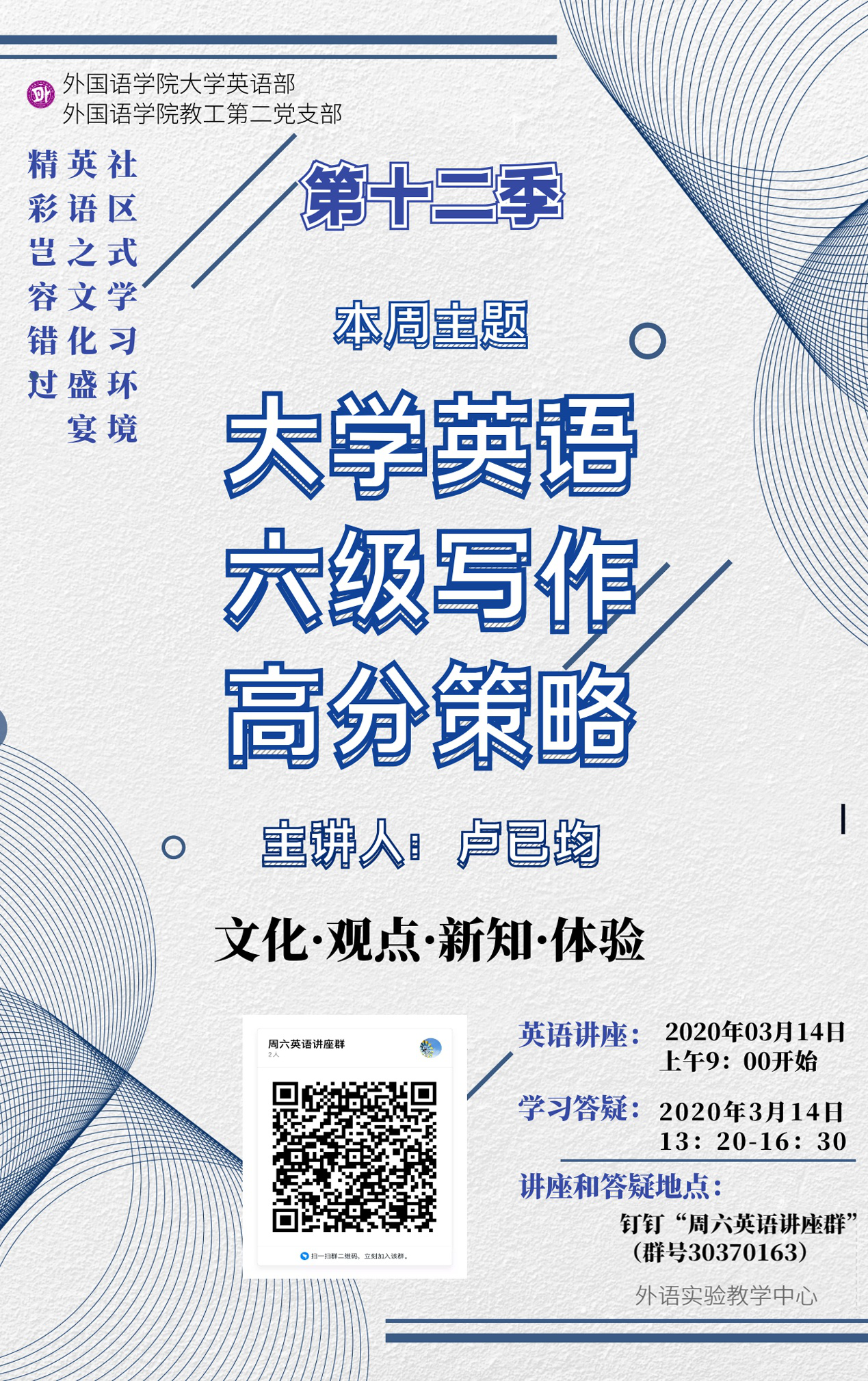 本学期根据宅家教学的安排,大学外语部和教二支部积极应对,在咨询技术支持和多方调试后,迅速把讲座调整为线上直播方式,并且采用多群联播来满足想参与讲座的所有学生需求。同时,学生还可以观看直播或回放;可以常速或倍速观看(辅之以笔记),从而满足学生多样化、个性化的学习需求,最大限度地发挥线上教学的优势。