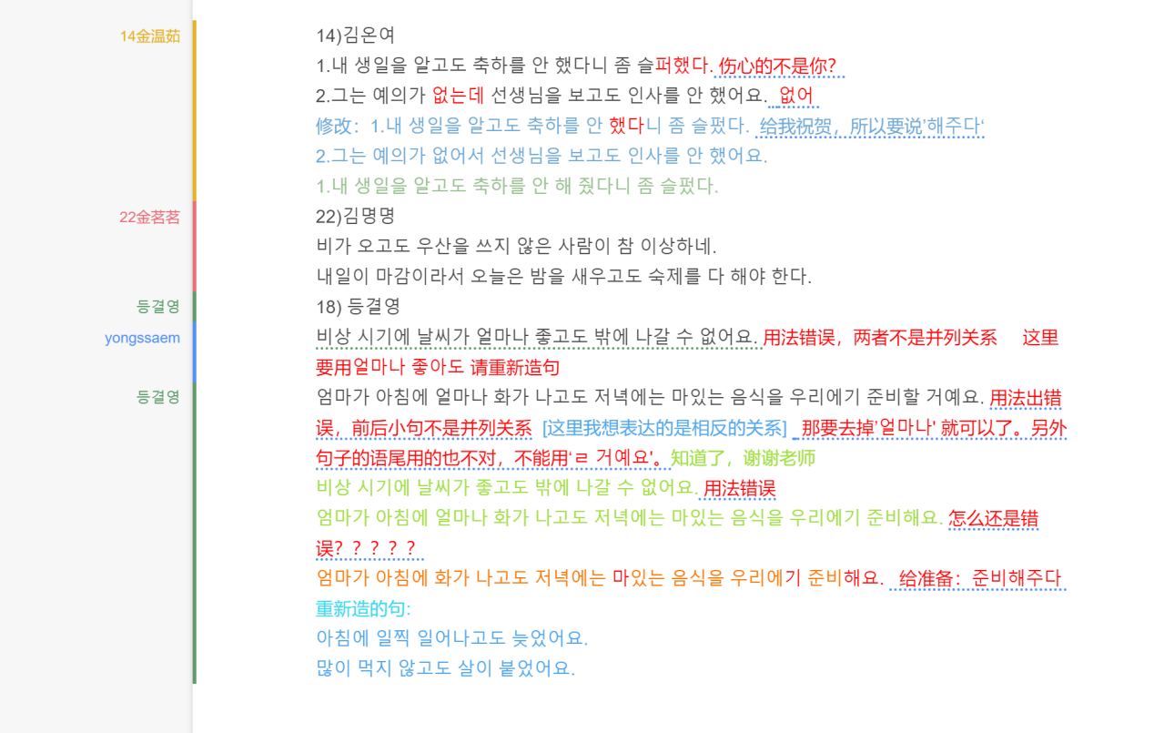 课后:主要有作业和小测验。个人作业中客观题在学习通上完成,主观题在石墨文档完成,发挥平台优势,实现教师批改作业最优化。小组作业采用集体打分方式,既考察了学生的团队协作能力,也通过师生互评方式,让更多的学生参与评价。另外,鉴于目前无法面对面沟通的局限,本学期增加了适合线上完成的“每日韩语新闻播报”等小组活动,丰富了课程活动的多样形式。