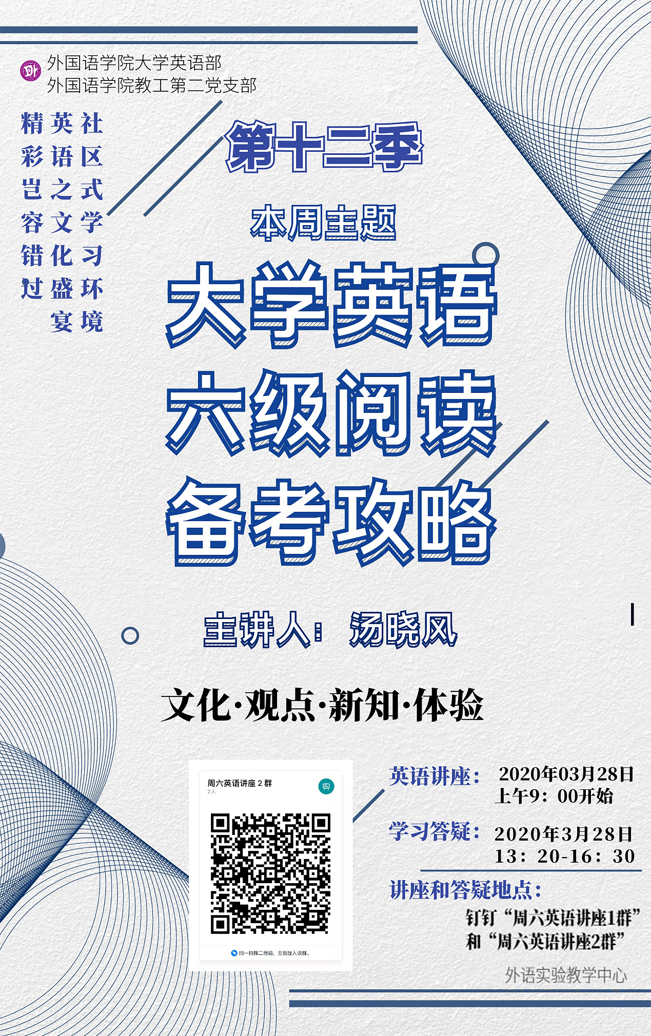 为更好地服务广大学生、满足其对英语学习的多样化和个性化需求,结合大学英语教学改革的实际,为在校学生营造良好的社区式英语学习氛围,从而提升学生的英语综合能力,大学外语部和教工第二党支部为全校学生开设的周末英语专题讲座活动目前已经进入了第十二季第三期。