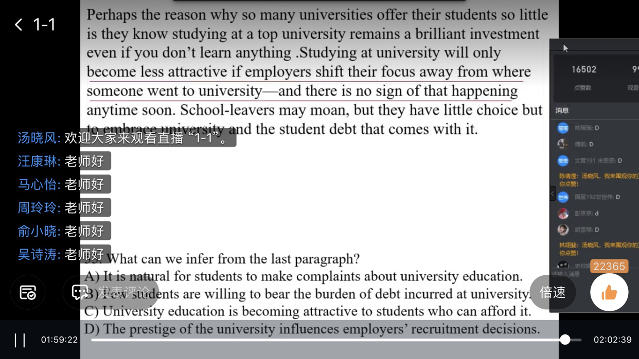 讲座长达两个多小时,但同学们听得都很认真,并通过做题积极与老师进行互动。讲座结束后,学生似乎还依依不舍,满屏的“老师再见”,足见此次讲座深受学生欢迎。本次讲座以线上多群联播方式进行,老师直播过程中,习题与策略相结合,边讲边练,学生随时可以通过“弹幕”的形式向老师提出问题,也可以在留言板块留下评价和建议。随着周六讲座在学生中的口口相传,加入讲座群的学生人数已达到1649人,由于部分学生时间冲突,本次讲座实际参与人数为1355位,首次突破1000人次,学生来源主要为2019级非英语专业的学生,同时,也吸引了部分英语专业及浙江外国语学院的学生来参加学习,观看直播的总人次达到2161次。