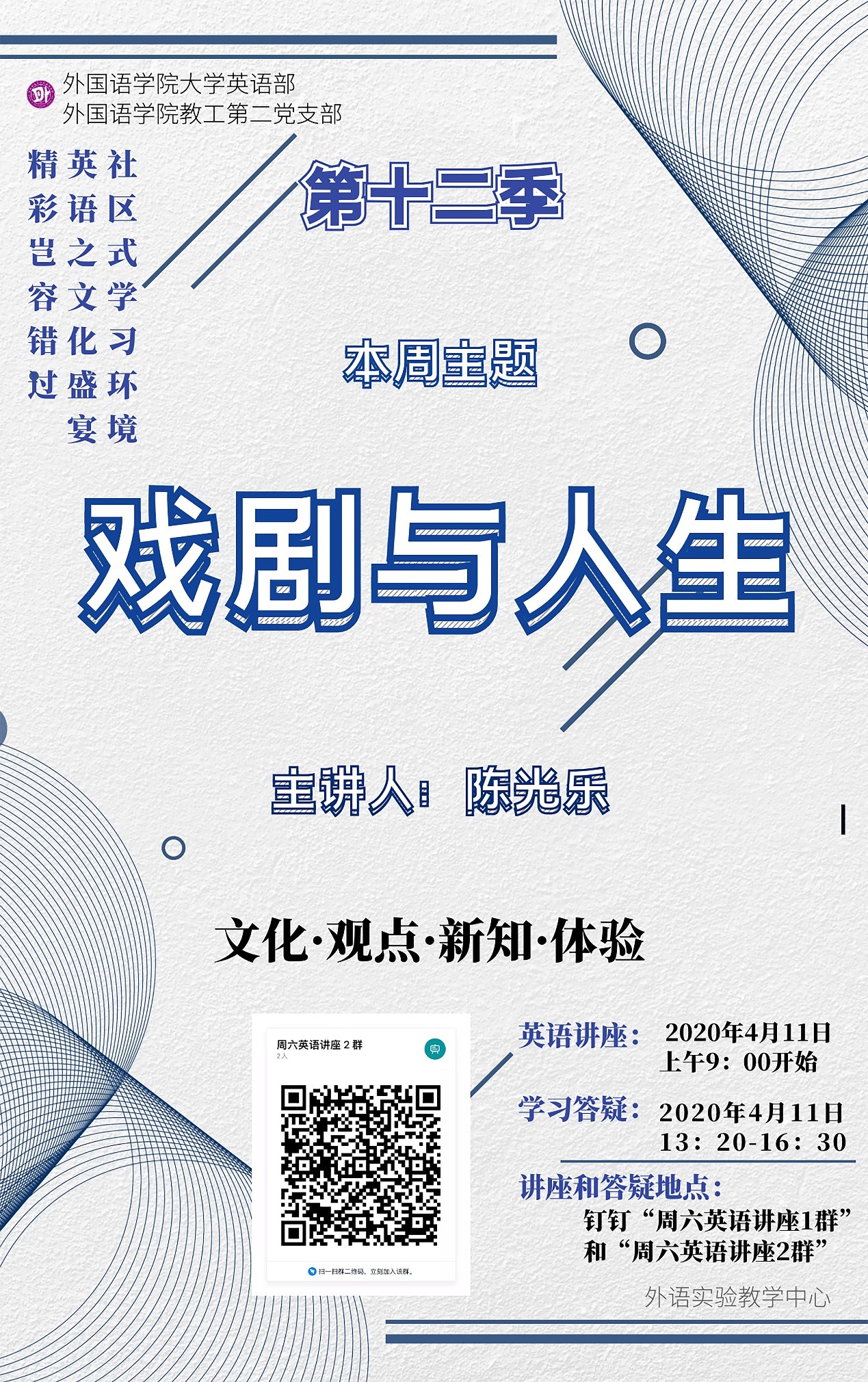为更好地服务广大学生、满足其对英语学习的多样化和个性化需求,结合大学英语教学改革的实际,为在校学生营造良好的社区式英语学习氛围,从而提升学生的英语综合能力,大学外语部和教工第二党支部为全校学生开设的周末英语专题讲座活动目前已经进入了第十二季第四期。