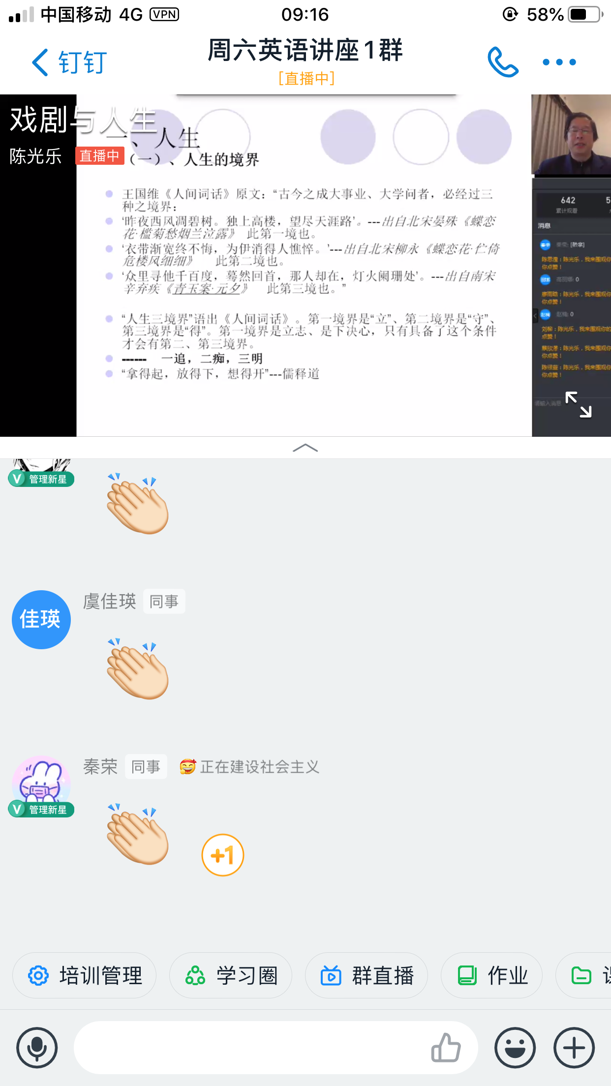 讲座长达两个多小时,但同学们听得都很认真,并积极与老师进行互动。本次讲座以线上多群联播方式进行,老师直播过程中,通过诗词、歌曲、戏剧独白等艺术形式一一展示戏剧的魅力,学生看得如痴如醉,不断通过“弹幕”向老师表达自己的仰慕之情。讲座结束后,学生似乎还依依不舍,满屏的“老师再见”,足见此次讲座的受欢迎程度。随着周六讲座在学生中的口口相传,加入讲座群的学生人数已达到1753人,由于部分学生时间冲突,本次讲座实际参与人数为1363位,继续研修1000+的人气,学生来源主要为2019级非英语专业的学生,同时,也吸引了部分英语专业及浙江外国语学院的学生来参加学习,观看直播的总人次达到2000多次。