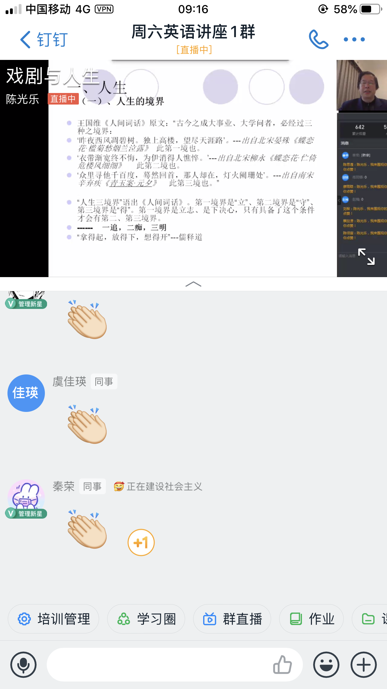 2020年4月11日周六上午9点,大学英语部的陈光乐老师给学生带来了一场题为“戏剧与人生”的讲座。本次讲座针对的是大一新生的讲座,考虑到每位同学的人生规划和外语学习,陈老师特意给同学们选取了四部著名的戏剧:《俄狄浦斯王》关注命运思考与尊严;《麦克白》关注欲望与恐惧;《野鸭》讨论怀疑与批判;《等待戈多》讨论绝望与虚无的问题,通过对戏剧节奏和戏剧情节的讲解为同学指导如何做好大学四年的规划。陈老师在讲座中把大学四年划分为初露锋芒(树新风 立壮志)、群雄逐鹿(夯基础 展个性)、平定仓前(稳节奏 重过程)、扬帆起航(迎掌声 看未来)四个阶段。讲座最后,陈老师提醒同学们:“人生就像一场戏,每个人的表演都有不一样的境界和精彩。社会的舞台为你准备了不同的角色,不要忘了你是集编导和主演于一身,人生的戏无法彩排,每场都得仔细斟酌,每幕都须认真对待。人生的戏不能删减,更不能嫁接。别人的戏无论有多绚烂,都无法编入你的剧情,成为你的精彩。” 讲座长达两个多小时,但同学们听得都很认真,并积极与老师进行互动。本次讲座以线上多群联播方式进行,老师直播过程中,通过诗词、歌曲、戏剧独白等艺术形式一一展示戏剧的魅力,学生看得如痴如醉,不断通过“弹幕”向老师表达自己的仰慕之情。讲座结束后,学生似乎还依依不舍,满屏的“老师再见”,足见此次讲座的受欢迎程度。