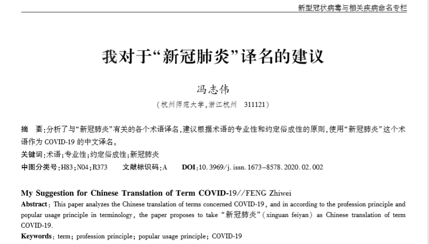 近日,外国语学院特聘教授冯志伟学术论文《我对于“新冠肺炎”译名的建议》在《中国科技术语》2020年第22卷第1期发表。在论文中,冯志伟教授分析了与“新冠肺炎”有关的各个术语译名,建议根据术语的专业性和约定俗成性的原则,使用“新冠肺炎”这个术语作为COVID-19的中文译名。