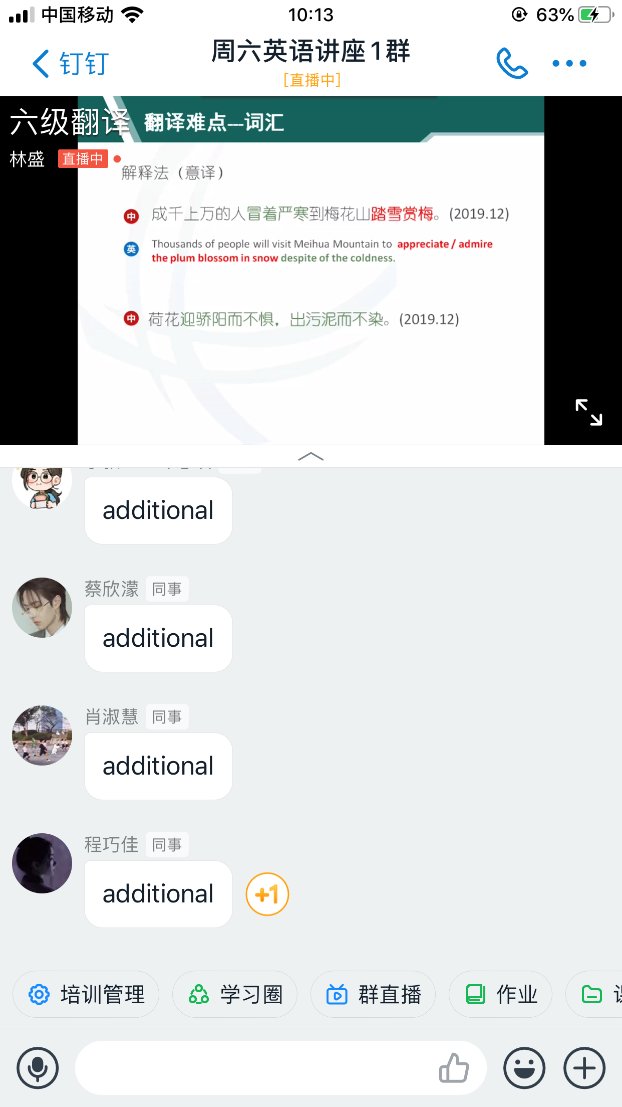 对于林老师在讲座伊始时提出的“六级翻译有多难”这个问题,到讲座结束时,同学们似乎都有了自己的体悟,对六级考试也增添了不少信心。直播长达两个多小时,但同学们似乎意犹未尽,满屏的“老师再见”,足见此次讲座的受欢迎程度。本次讲座以线上多群联播方式进行,老师直播过程中练习与策略讲解相结合,边讲边练,学生随时可以通过“弹幕”的形式向老师提出问题,也可以在留言板块留下评价和建议,线上互动频繁。