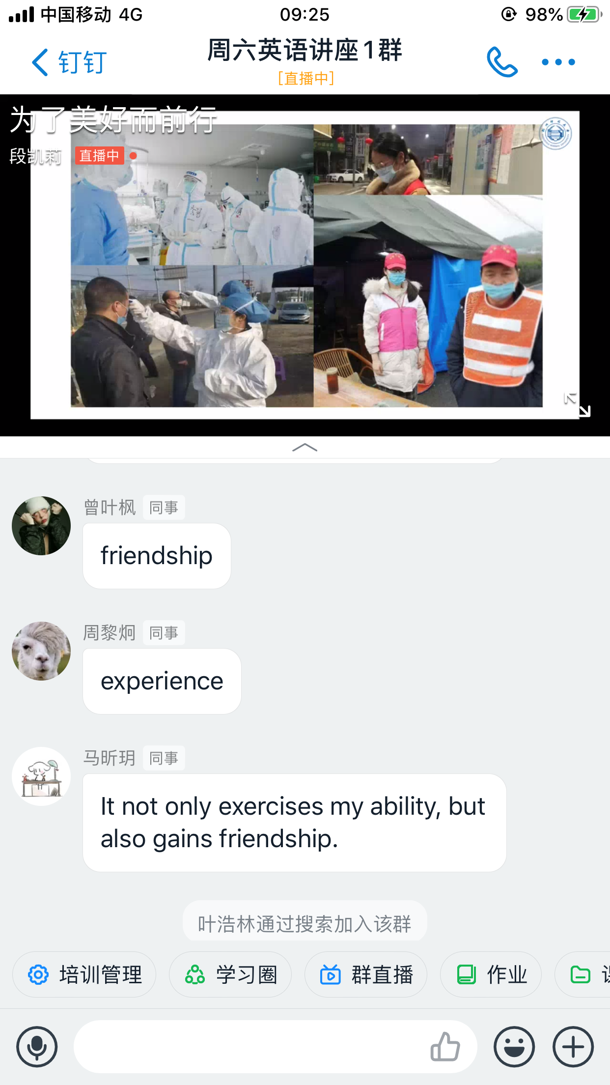 随着周六讲座在学生中的口碑效应,原有的两个讲座群都很快满员,应学生的需求,特意建了一个新群。目前加入讲座群的学生总人数已达到1878人,由于部分学生时间冲突,截止到5月17日晚12点,本次讲座实际参与学生数为1252人,已连续五周突破1000人次,同时,依然源源不断有学生选择直播回放,继续在“周六英语学习社区”里努力学习。学生来源主要为2019级非英语专业的学生,同时,也吸引了部分英语专业及浙江外国语学院的学生来参加学习,观看直播的总人次达到1804次。